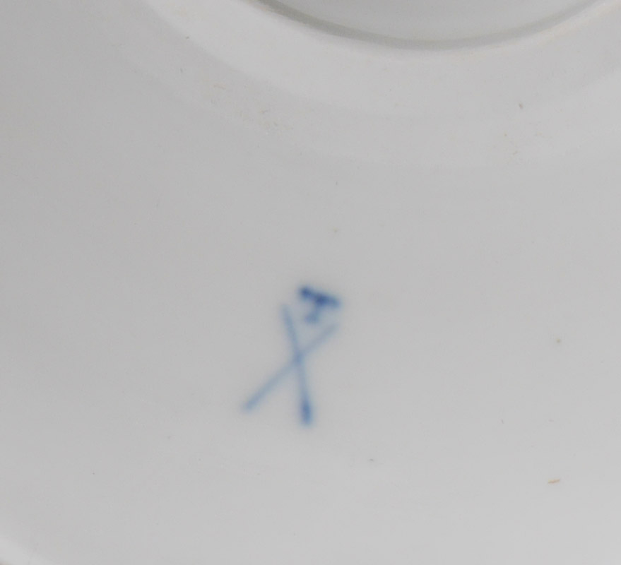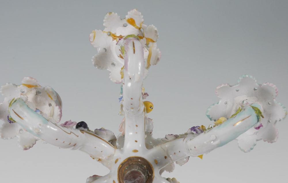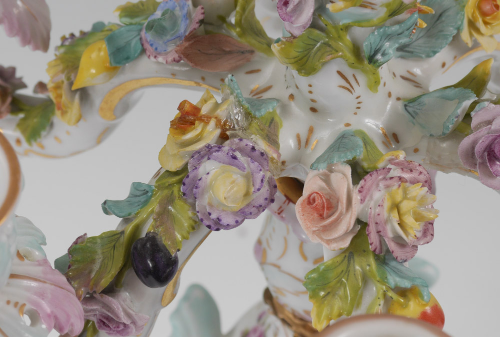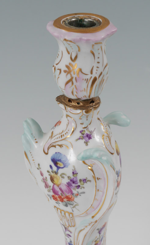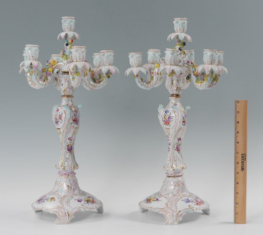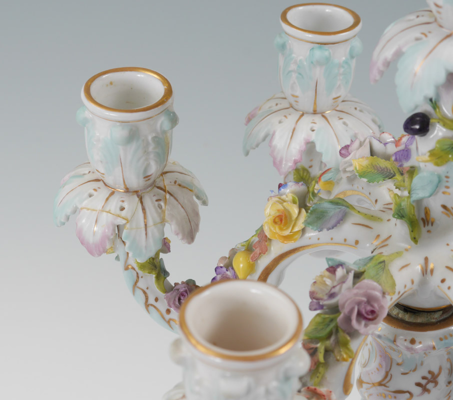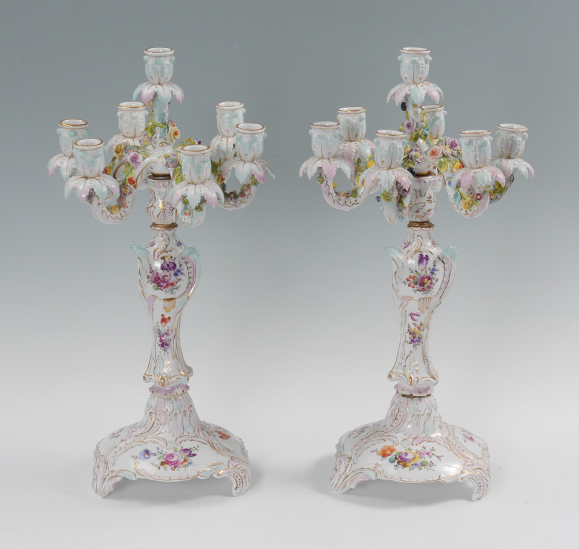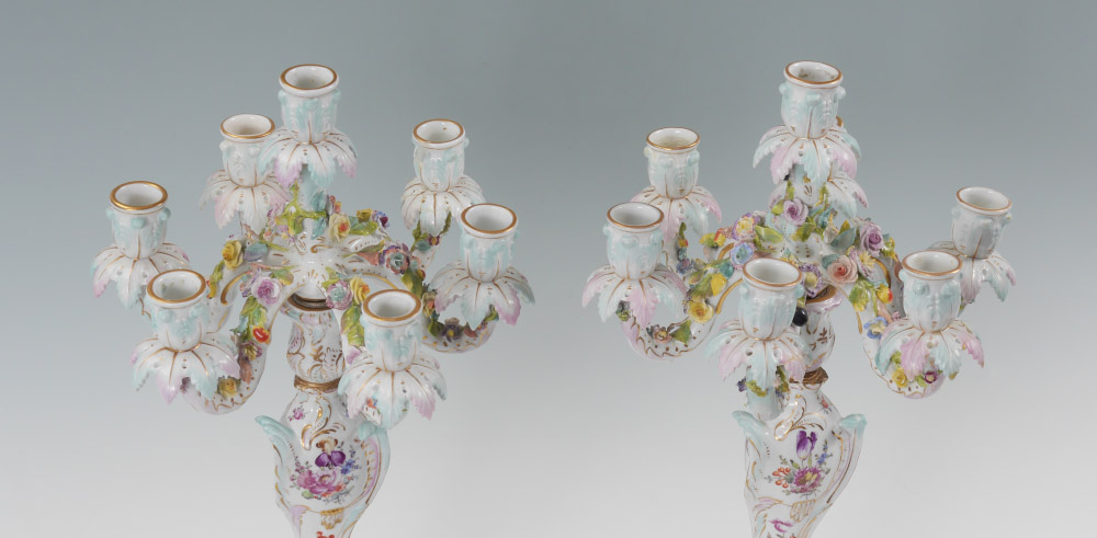 PAIR CARL THIEME FLORAL PORCELAIN CANDLESTICKS: Matched pair, 6 arms plus center light with applied floral decoration. Blue underlgaze Saxonian Factory Carl Thieme mark on base. Overall 20 1/4'' h. x 10 1/2''.