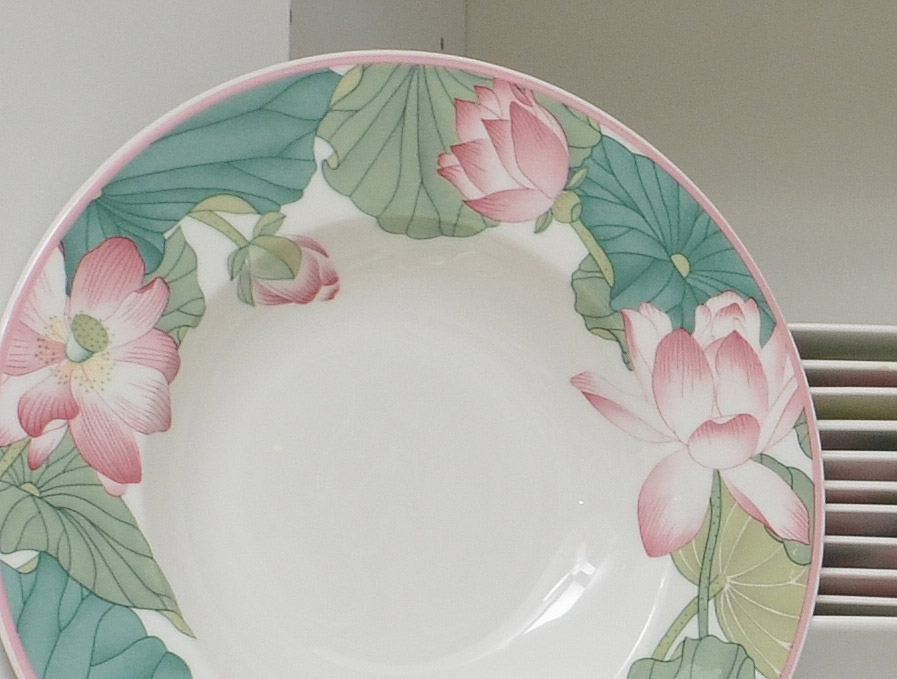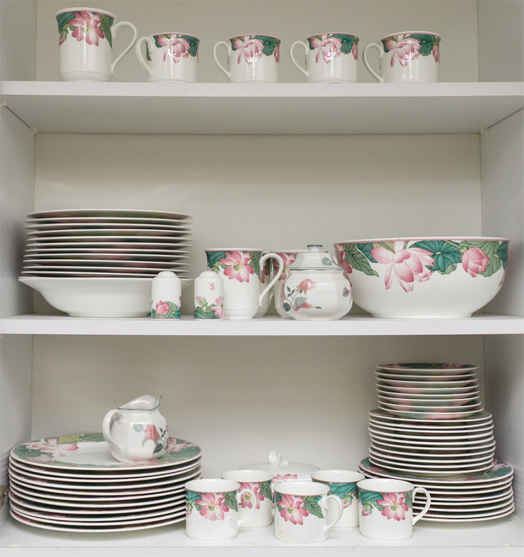 VILLEROY AND BOCH ''JADE'' CHINA: Approx. 74 pieces to include 11 dinner plates (10 5/8''), 8 salad plates, 10 bread plates, 12 soup bowls, 8 cups, 8 saucers, 9 mugs, creamer, sugar, covered butter, salt & pepper shakers, and 3 open vegetable bowls, each a different shape.