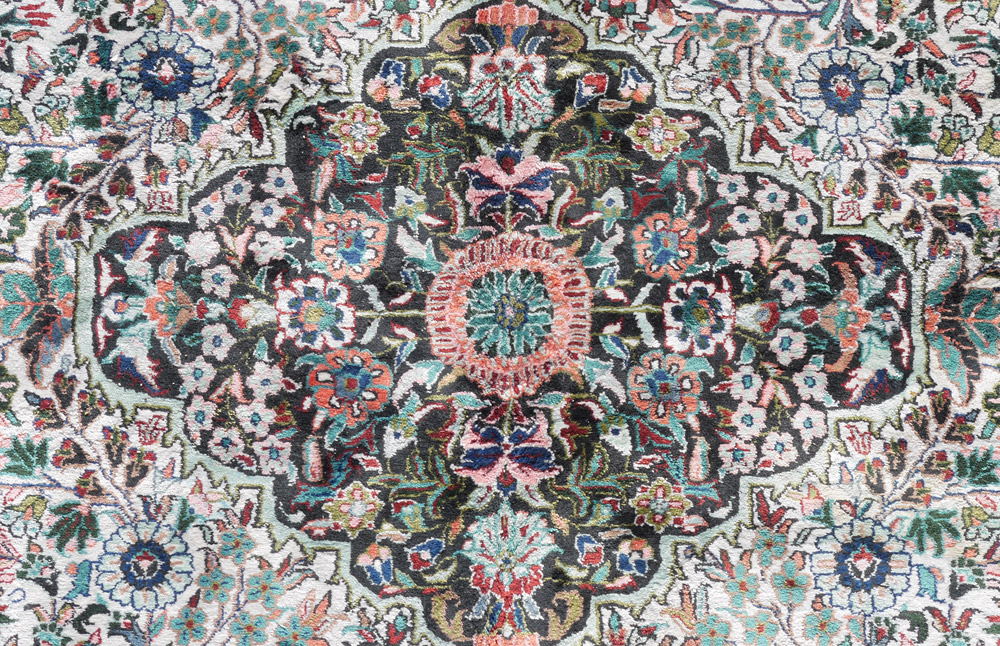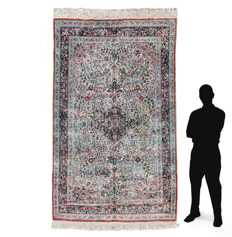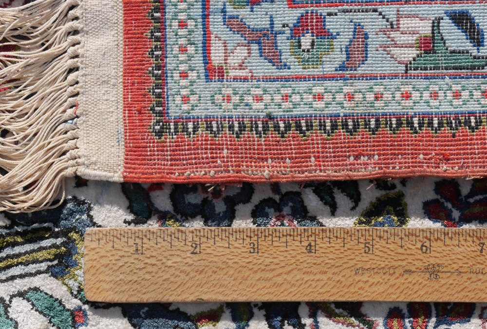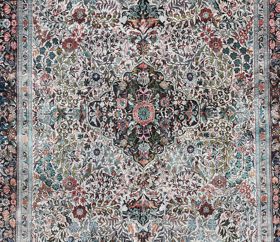 APPROX 20-30 YR. OLD SINO-PERSIAN HAND KNOTTED WOOL RUG, 5'9'' x 8'10'': This lovely rug has a small diamond shaped central medallion with spandrels at either end all done in a blue/black ground. The ivory field is densely covered with sprays of various flowers done in colors that include shades of blue, pink, rose, and dark red. Hiding in the flowers are pairs of birds, one mate on each side of the field. The blue/black main border also has birds tucked in here and there among the sprays of flowers. There is color change in the last border of the rug.