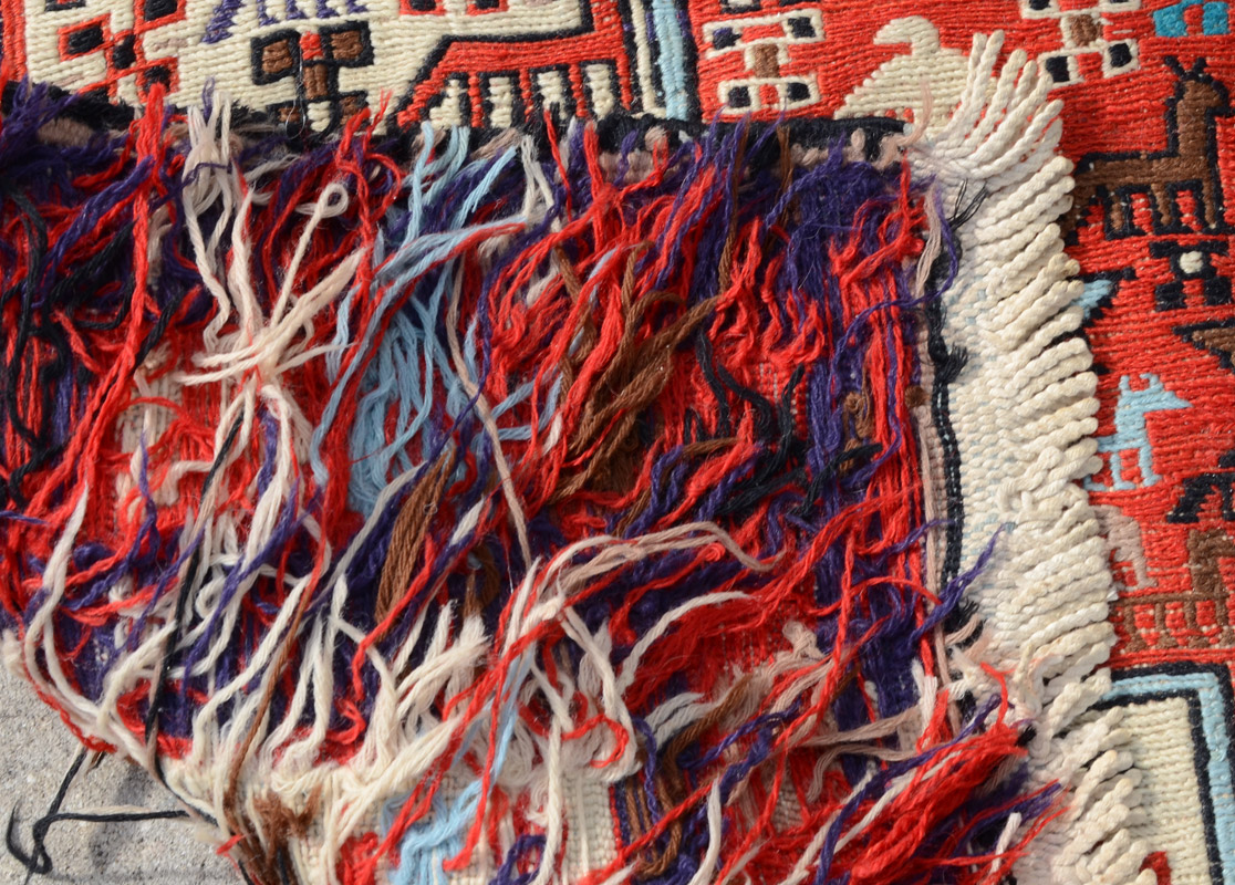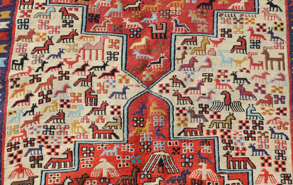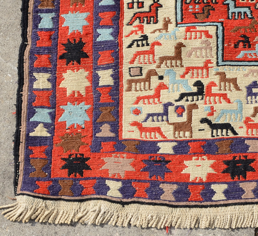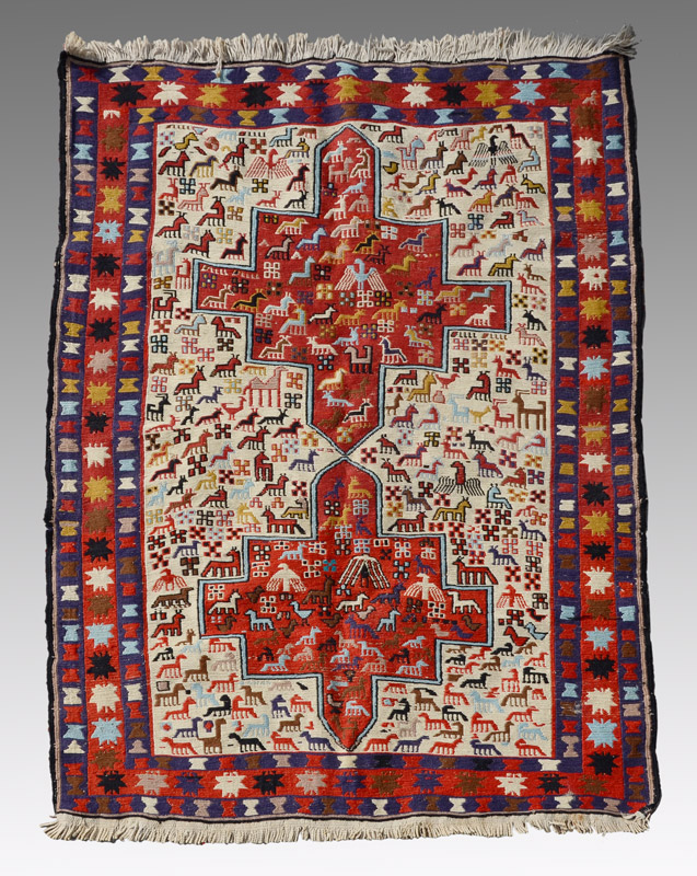 APPROX 20-35 YR OLD PERSIAN SHAH-SEVAN SOUMAC HAND WOVEN WOOL RUG, 3'7'' x 4'8'': This charming tribal flat weave rug has an ivory field with two brick red central medallions with pale blue outline. Covering the field and medallions are innumerable small animals and birds. The three borders in brick red and a purplish blue pen these lively animals in. This rug has a lot of primitive appeal. Condition is good.