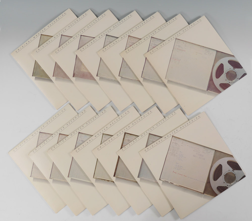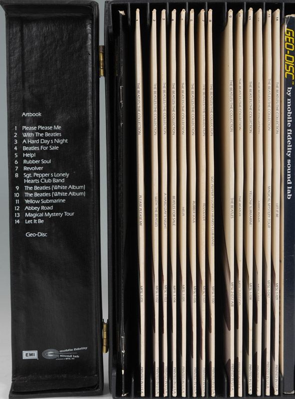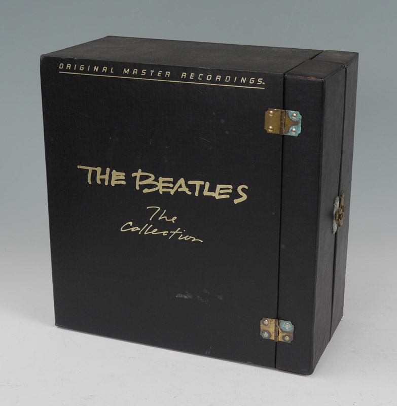 THE BEATLES ''THE COLLECTION'' RECORDS AND BOOK: Published in 1982 by EMI with Mobile Fidelity Sound Lab, box set comes with 14 records with original sleeves and slip cases, art book, and Geodisc. Black presentation box with gold embossed lettering, box measures 13 1/4'' x 13'' x 6 1/2''. Sold with ''The Complete Beatles Volume One, A-I'' book of Piano, Guitar and Vocals.