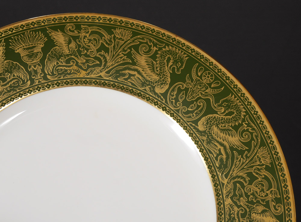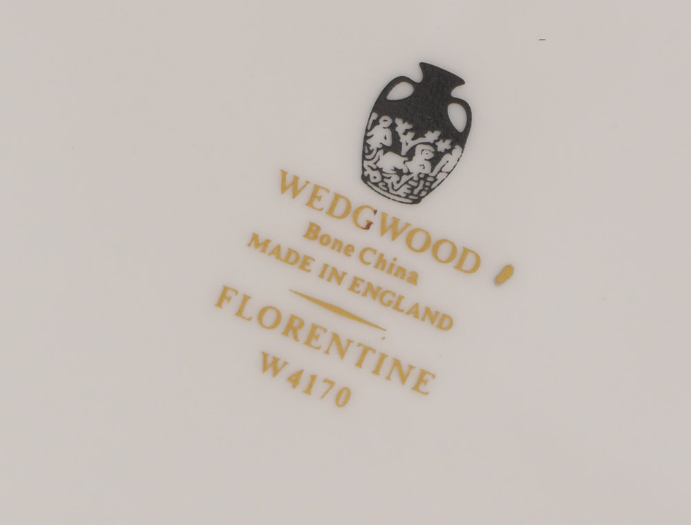 WEDGWOOD FLORENTINE FINE CHINA SERVICE: Approx. 89 pieces to include 12 each of dinner plates (10.75''), salad plates (8''), bread plates (6''), cream soups with saucers, cups and saucers, and 2 open vegetable bowls, creamer, sugar, and teapot.