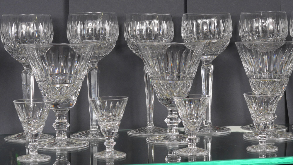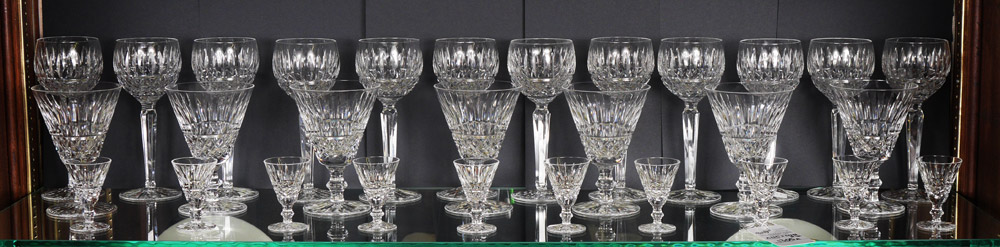 WATERFORD ''TRAMORE'' CUT CRYSTAL STEMWARE: 29 pieces to include 12 wine hocks (7.5''). 7 goblets (5.5''), and 10 cordials (2.75'').