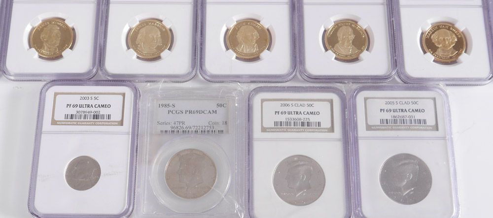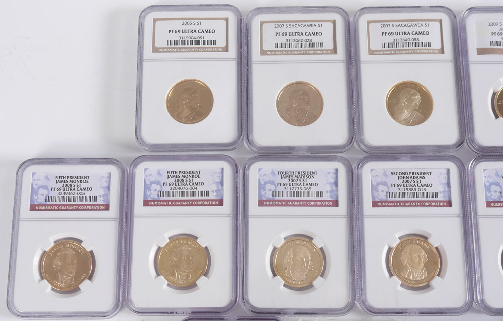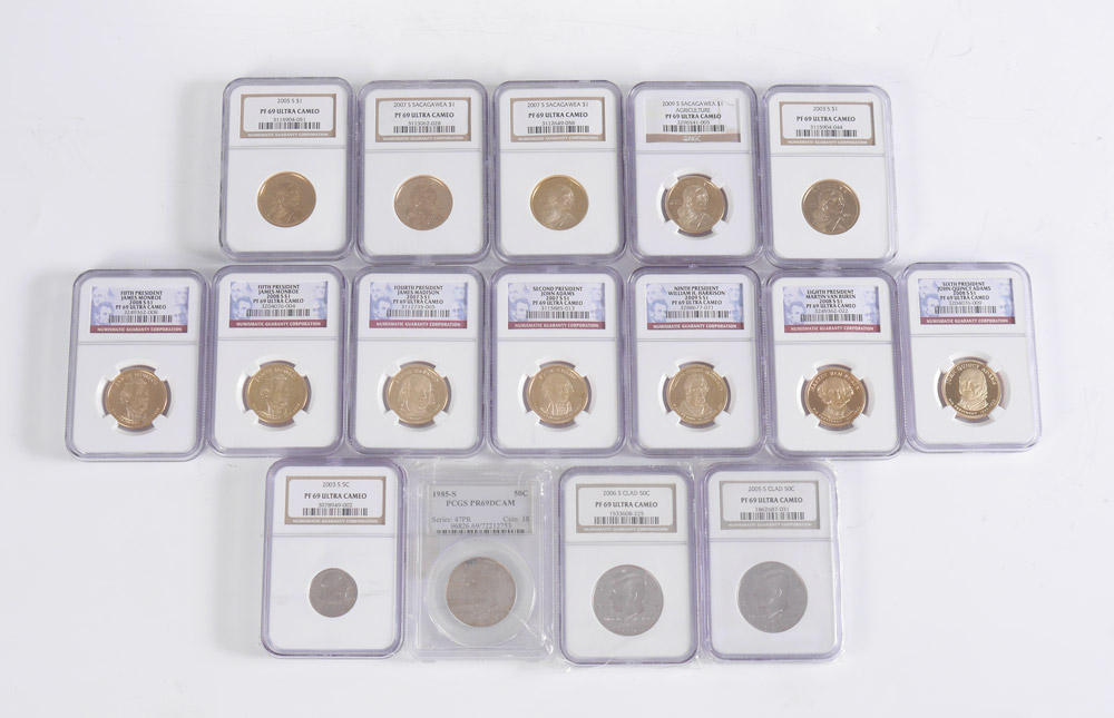 COLLECTION OF NGC GRADED COINS: 16 coins total, 15 graded PF69 Ultra Cameo to include 5 Sacagawea $1 (2003-S, 2005-S, two 2007-S, 2009-S); 2003-S 5 cent; 2005-S Clad 50 Cent, 2006-S Clad 50 cent; 7 assorted President $1. Sold with PCGS PR69 Cameo 1985-S 50 Cent. All slabbed.