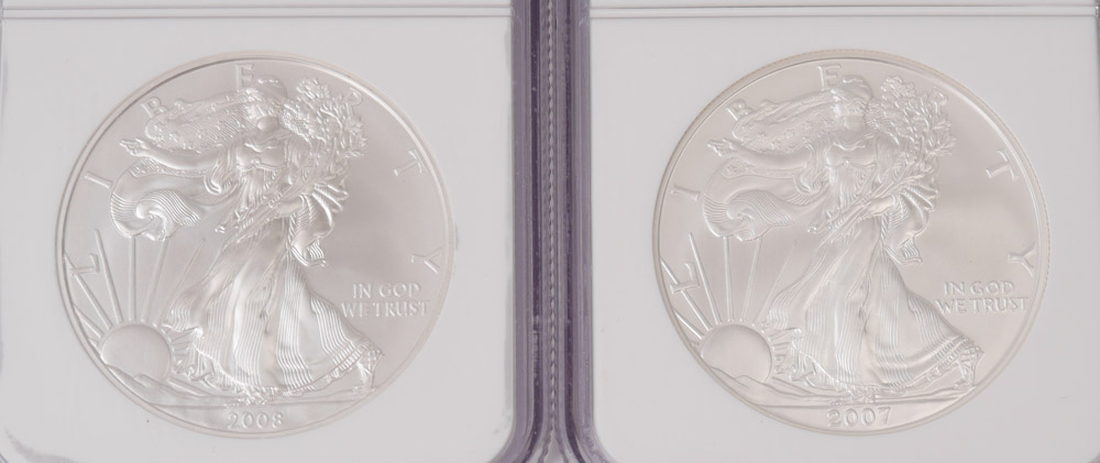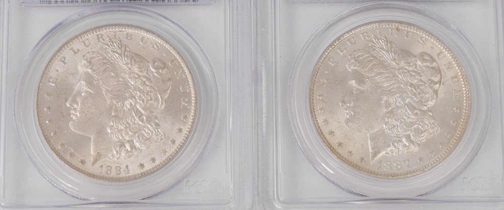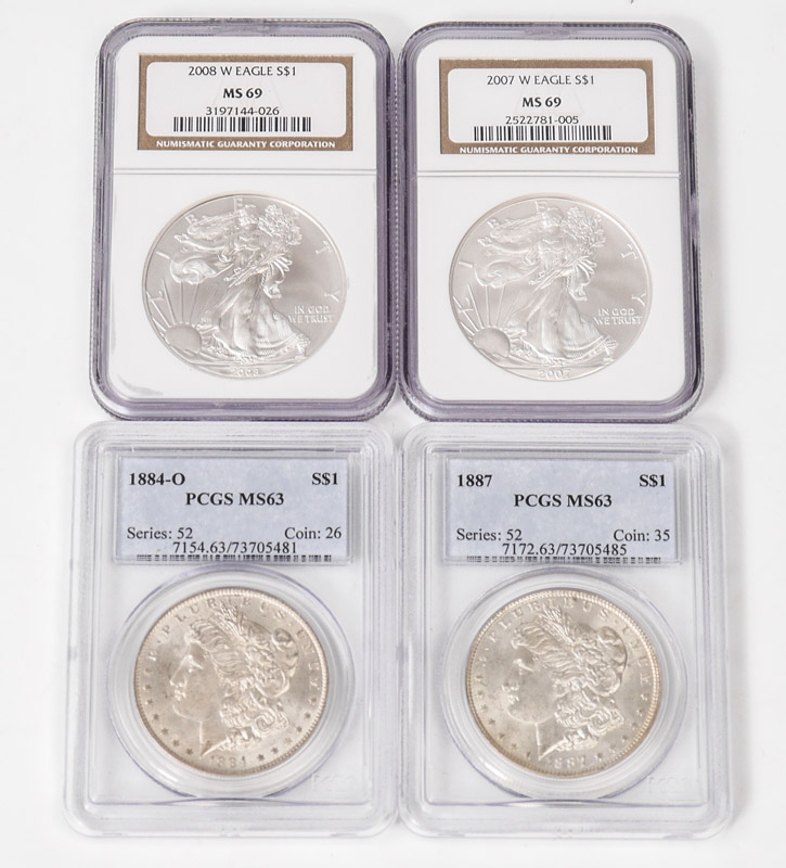 4 GRADED US SILVER COINS: 4 coins total to include 1) 1884-O Morgan dollar, PCGS MS63. 2) 1887 Morgan dollar, PCGS MS63. 3) 2007 W Eagle $1, NGC MS69. 4) 2008 W Eagle $1, NGC MS69.