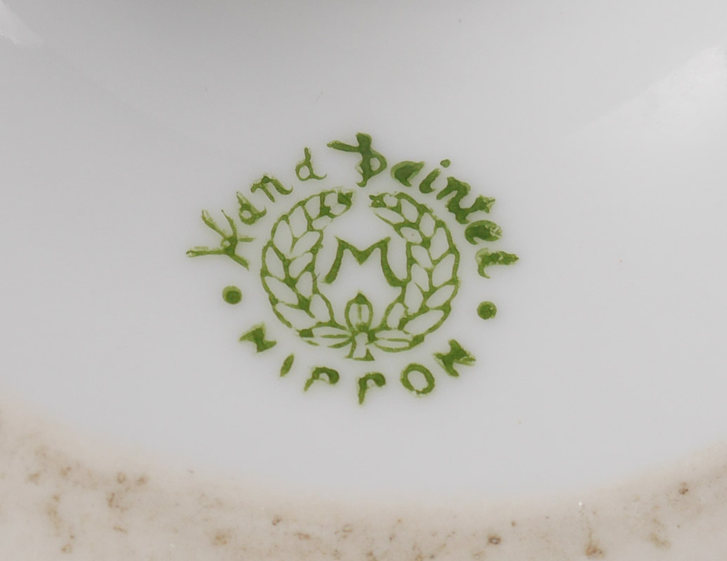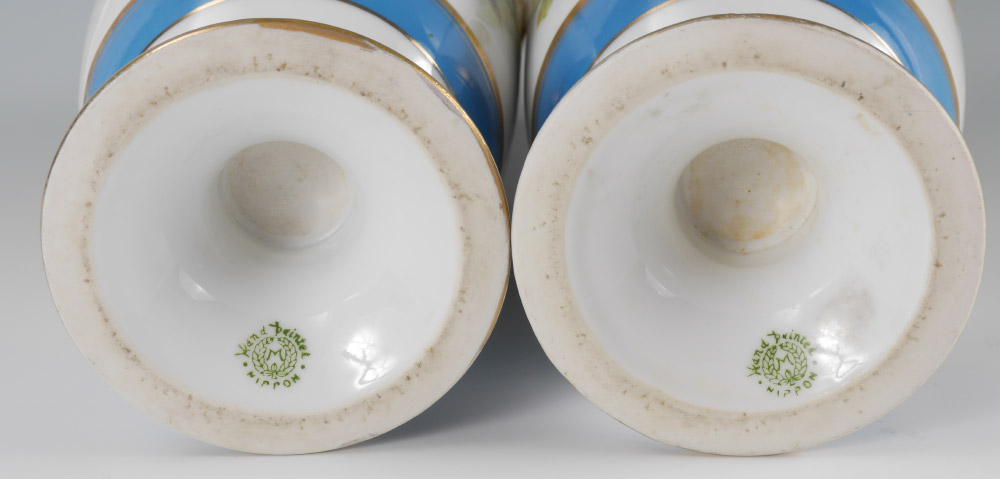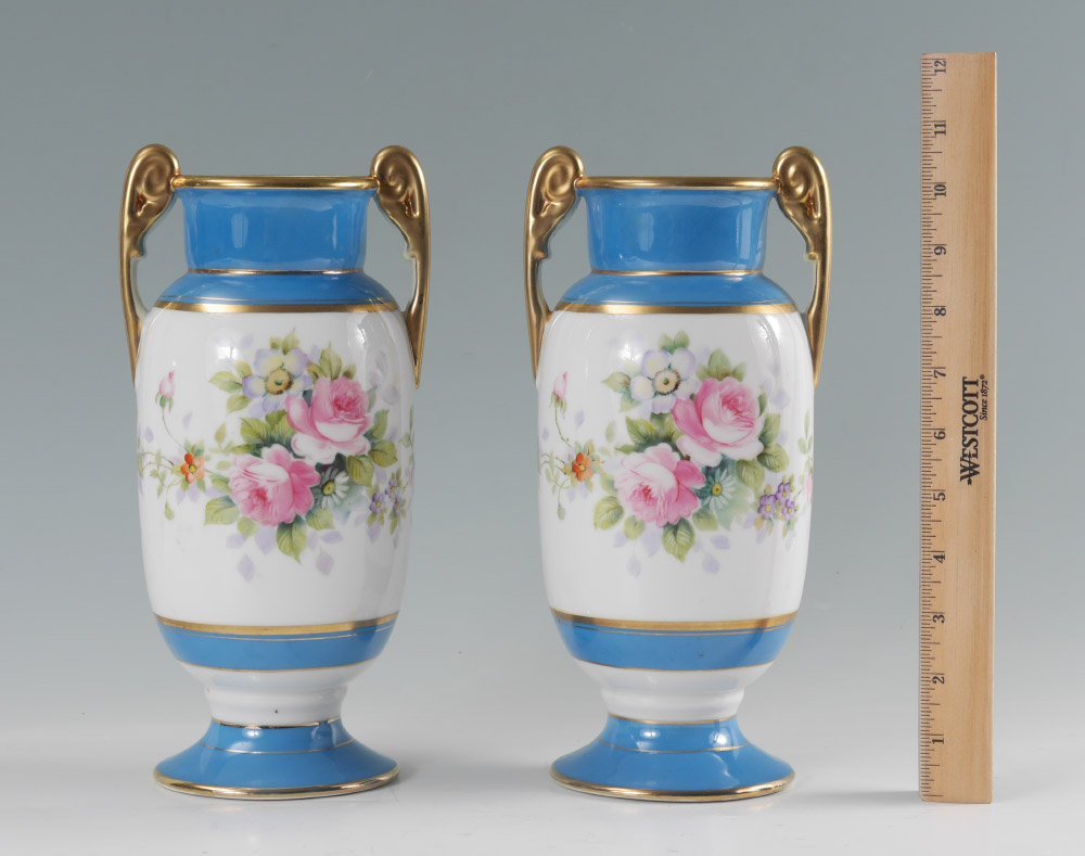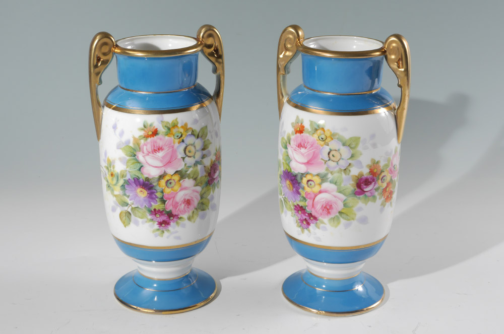 PAIR OF HAND PAINTED NIPPON VASES: Gilt handles and trim, hand painted floral decoration, green Nippon stamp on base. 10 3/4'' h. x 5 1/2''.