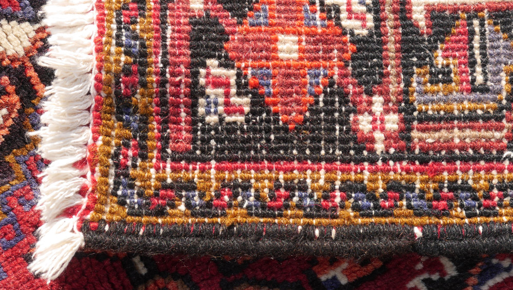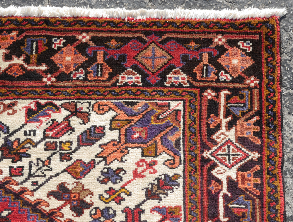 APPROX. 20-35 YR. OLD PERSIAN HERIZ HAND KNOTTED WOOL RUG, 5' x 6'7'': This Heriz has a traditional design that includes a lobed central medallion with a blue center outlined by black and white and black spandrels at either end of the medallion. The salmon colored field is bordered by four white corners. The corners and the rest of the field are further covered by vines, flowers and leaves that radiate out from the central medallion. The dark blue/black main border completes the rug. Condition is good.