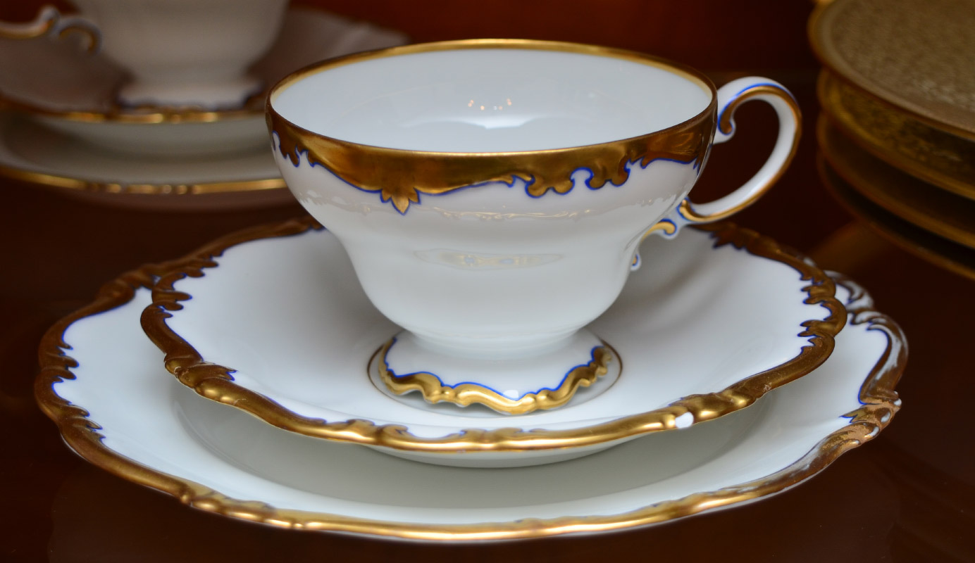 ROSENTHAL POMPADOUR FINE CHINA DESSERT SET: Approx. 40 pieces, white with gold edges outlined in navy blue and black. To include coffee pot (11''), creamer, sugar, tea pot, demitasse pot with creamer and sugar, 6 cups and saucers, 6 demi cups and saucers, 6 dessert plates (7''), and the 13'' cake plate.