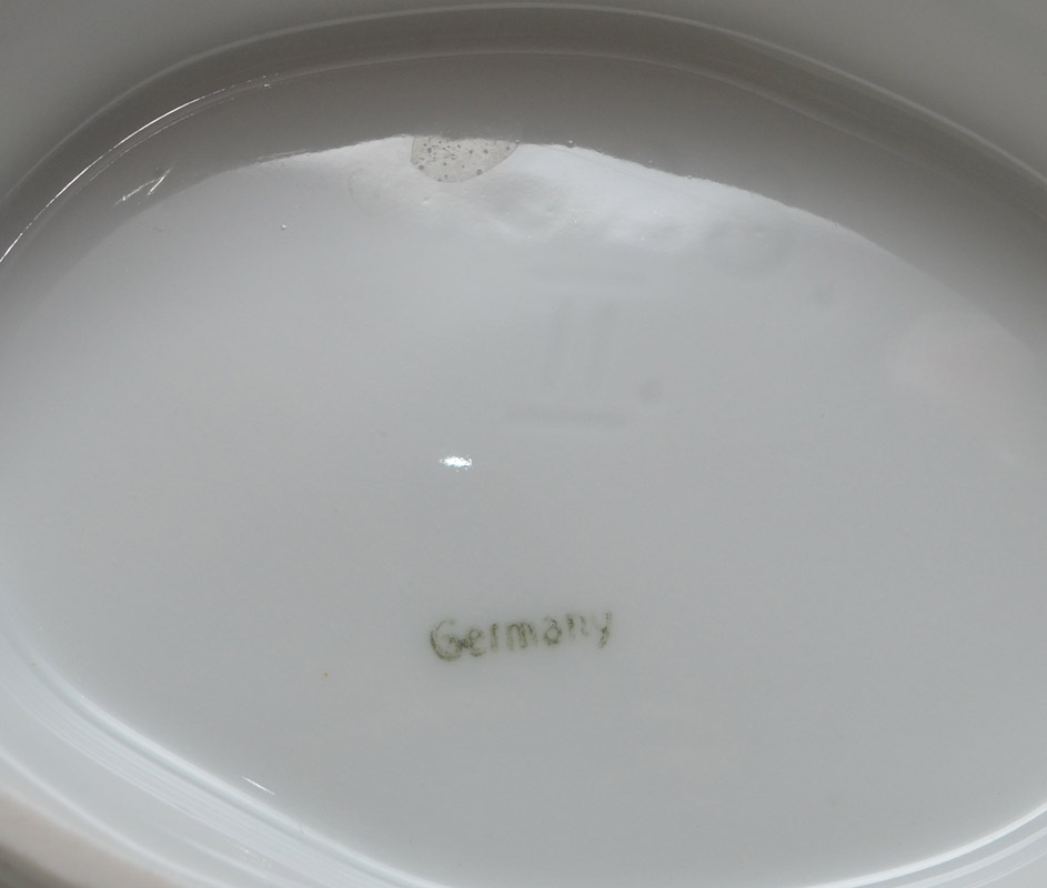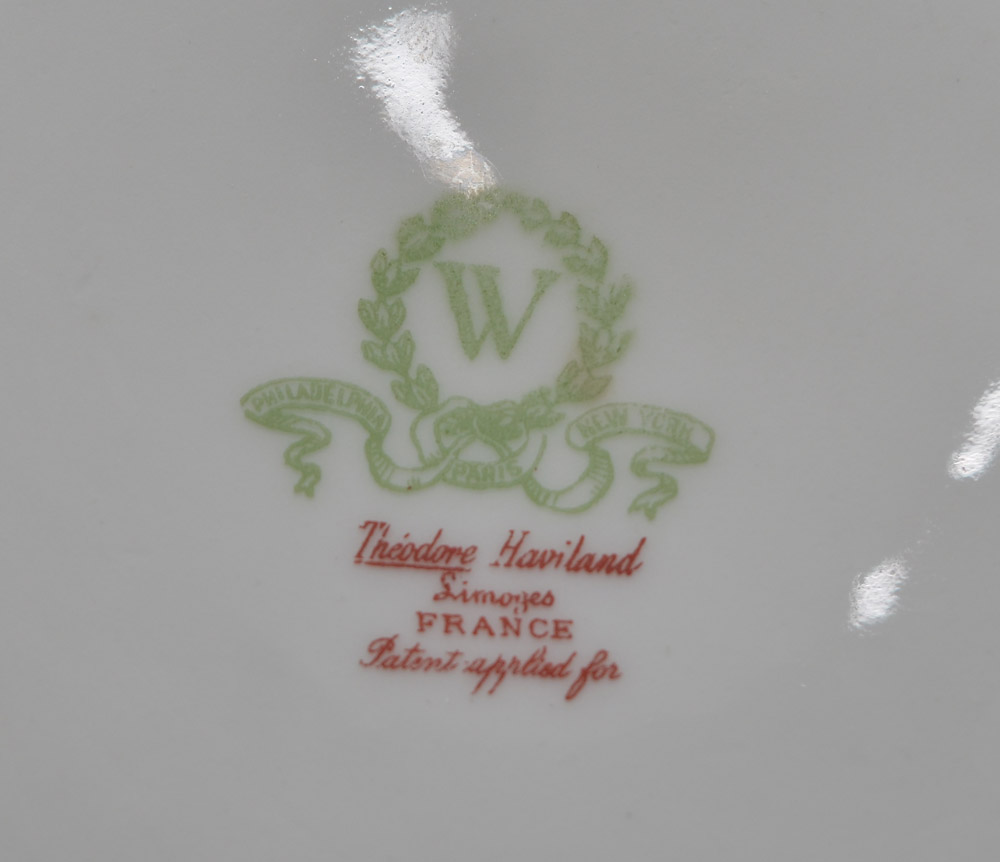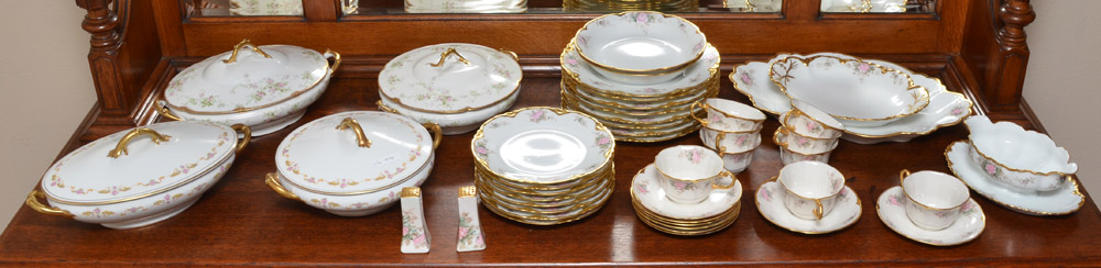 SET OF HAND PAINTED CHINA: Approx. 39 pieces studio hand painted china, predominately Haviland Limoges, also Austrian and German blanks were used. 8 each of dinner plates (9.5''), 8 salad plates, 8 cups and saucers, gravy, oval vegetable, 2 soup bowls, 2 shakers, 10'' platter. ALSO sold in this group are 4 covered vegetable bowls in a rose transfer patterns.