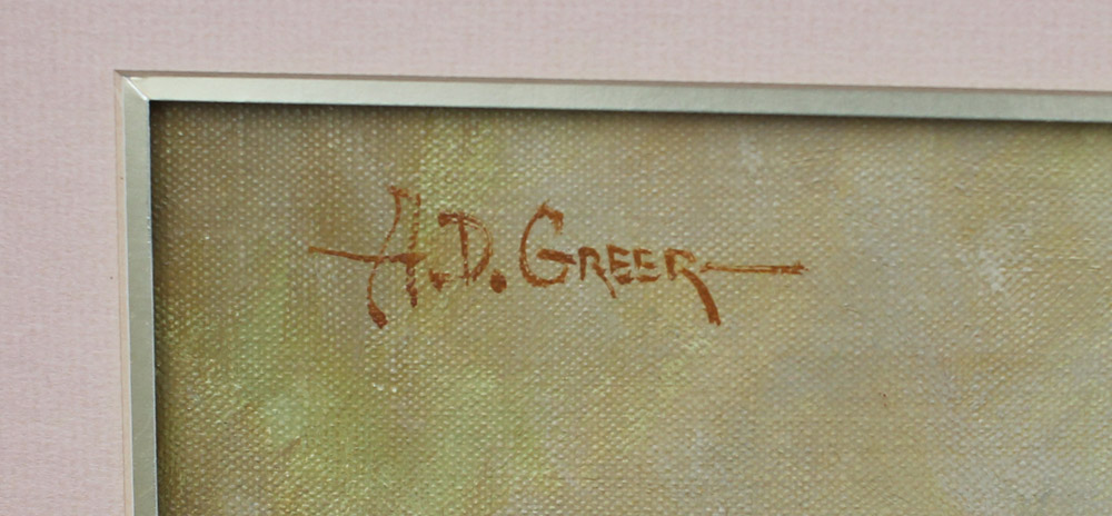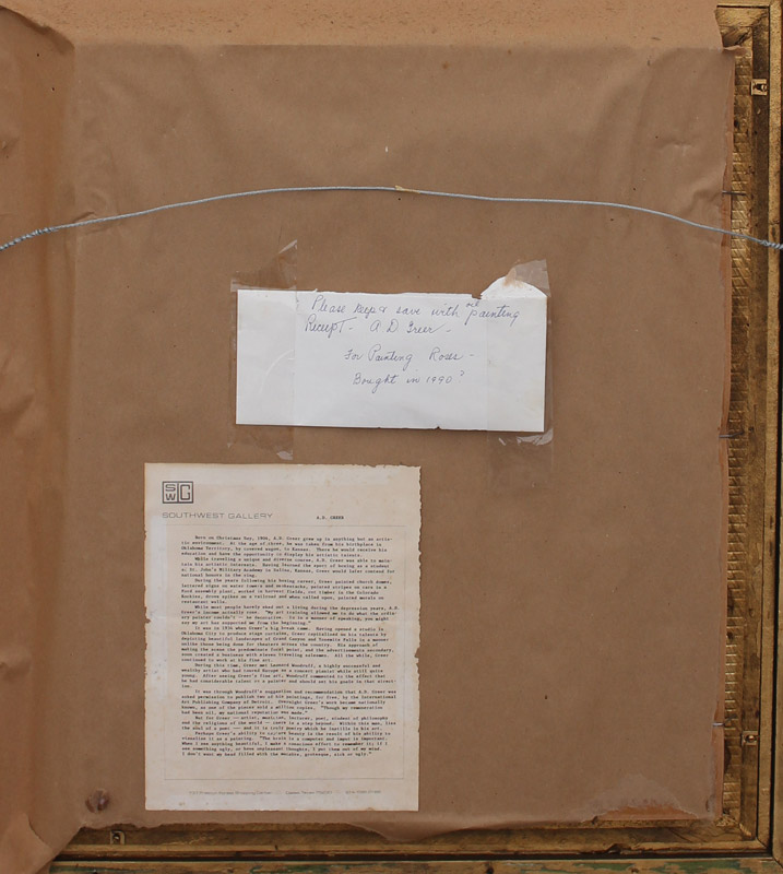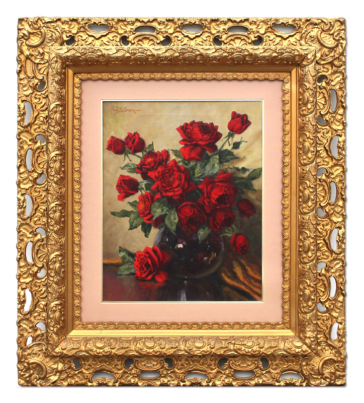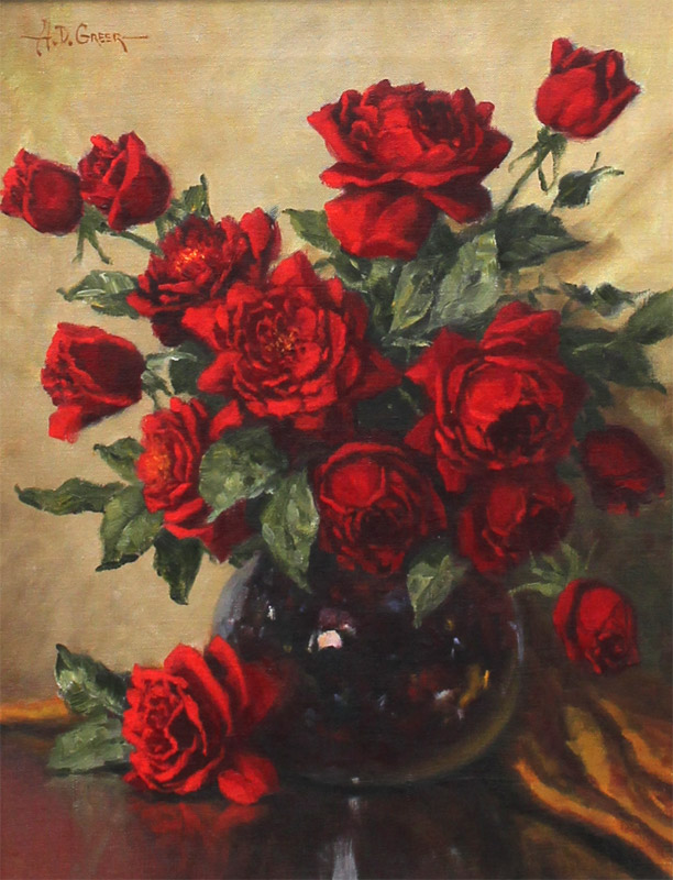 GREER, Aubrey Dale, (American, 1904-1998): Still Life of Roses, Oil/Canvas, 20'' x 16'', signed upper left, pierced, carved and painted frame, 35.5'' x 31.5''. Original receipt from Southwest Gallery purchased in 1990 for $1,600.