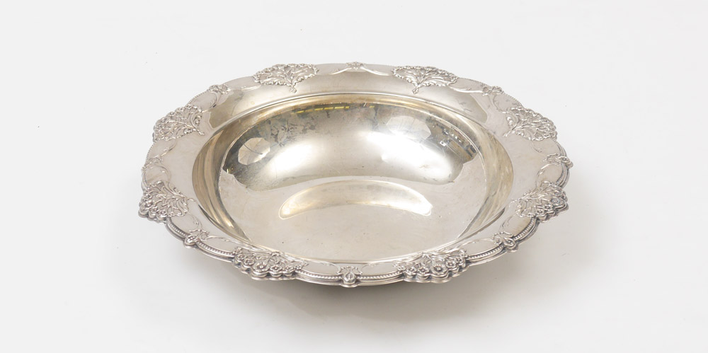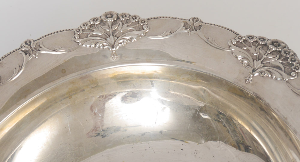 INTERNATIONAL SILVER STERLING SERVING BOWL: Repousse floral and garland rim, marked on base with International, Sterling, D321. 2'' h. x 11'', approx. 13.8 troy oz.
