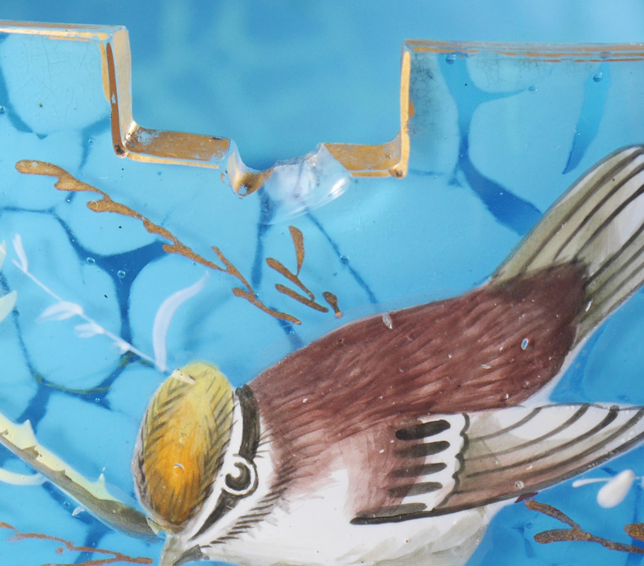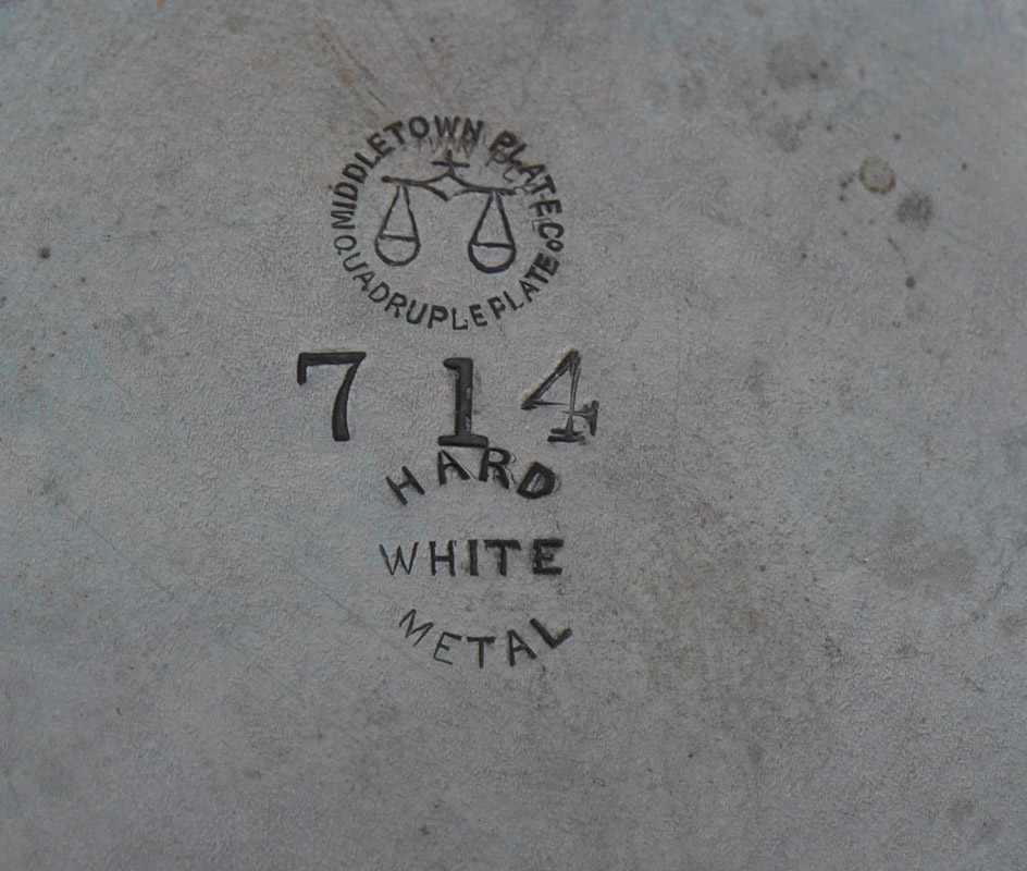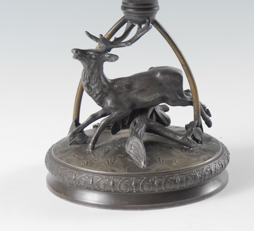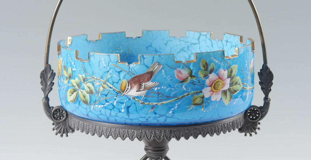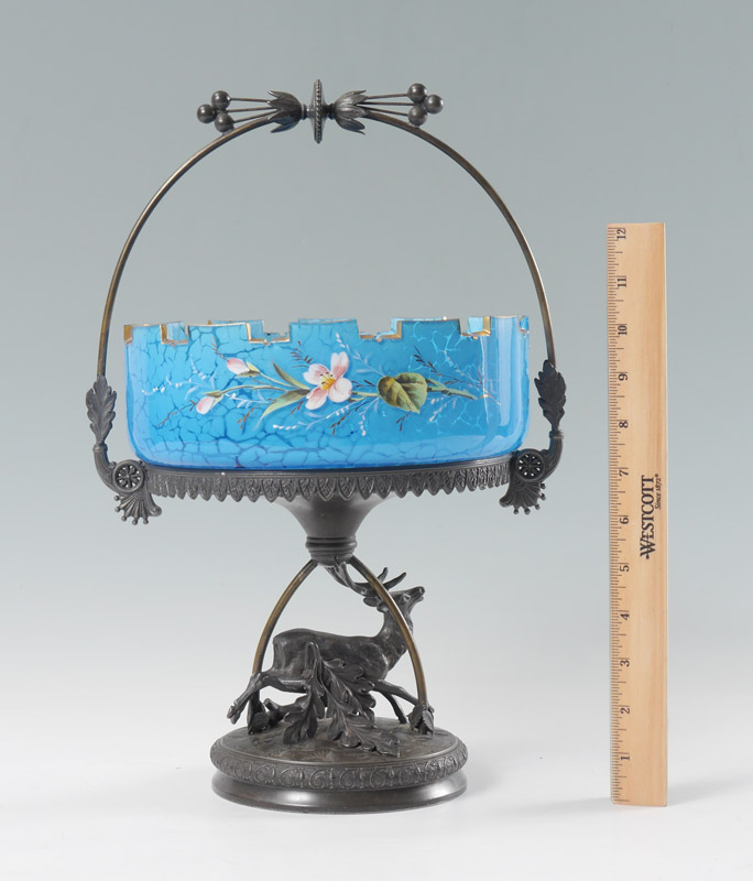 MIDDLETOWN FIGURAL STAG BRIDES BASKET: White metal with figural leaping stag base, pattern #714, marked on base. Enamel blue glass bowl with floral motif. Overall measures 15 1/2'' h. x 10 3/4''.