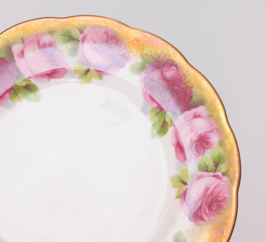 ROYAL ALBERT MOTHER'S DAY LUNCHEON SET: Approx. 33 pieces in the ''Mother's Day'' pattern by Royal Albert, gilt rim with transfer rose decoration border, to include 8 luncheon plates (7 3/8''), 9 teacups & 10 saucers (5 1/4''), teapot (6'' x 10 1/2''), open cream, open sugar, serving plate (10'' dia.), rectangular tray (11'' x 5 1/4''), rectangular dish (7 1/4'' x 5'').