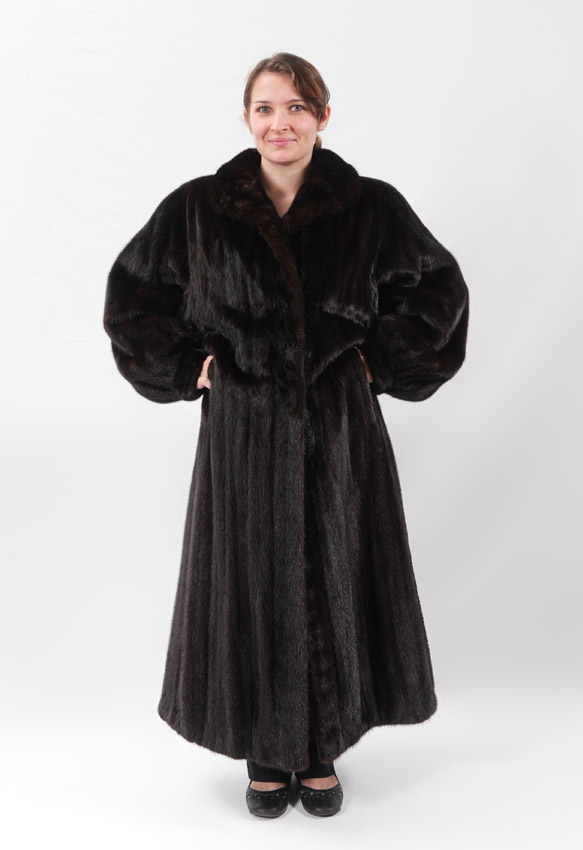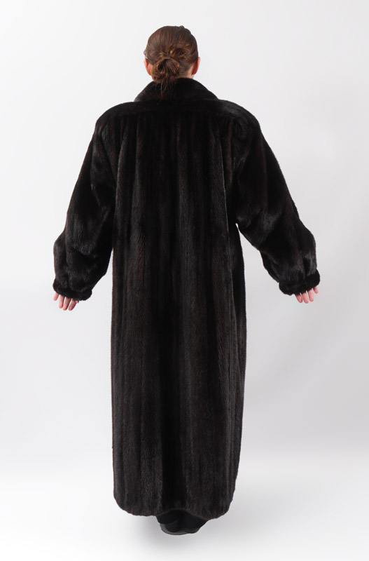 FULL LENGTH MINK FUR COAT: Luxurious dark fur with silver luster. Fitted cuffs. Large size measures 50'' collar to hem, 18'' shoulder to shoulder and 22'' shoulder to cuff.