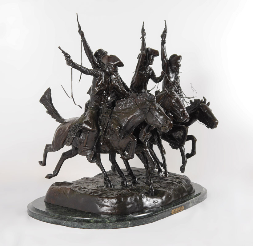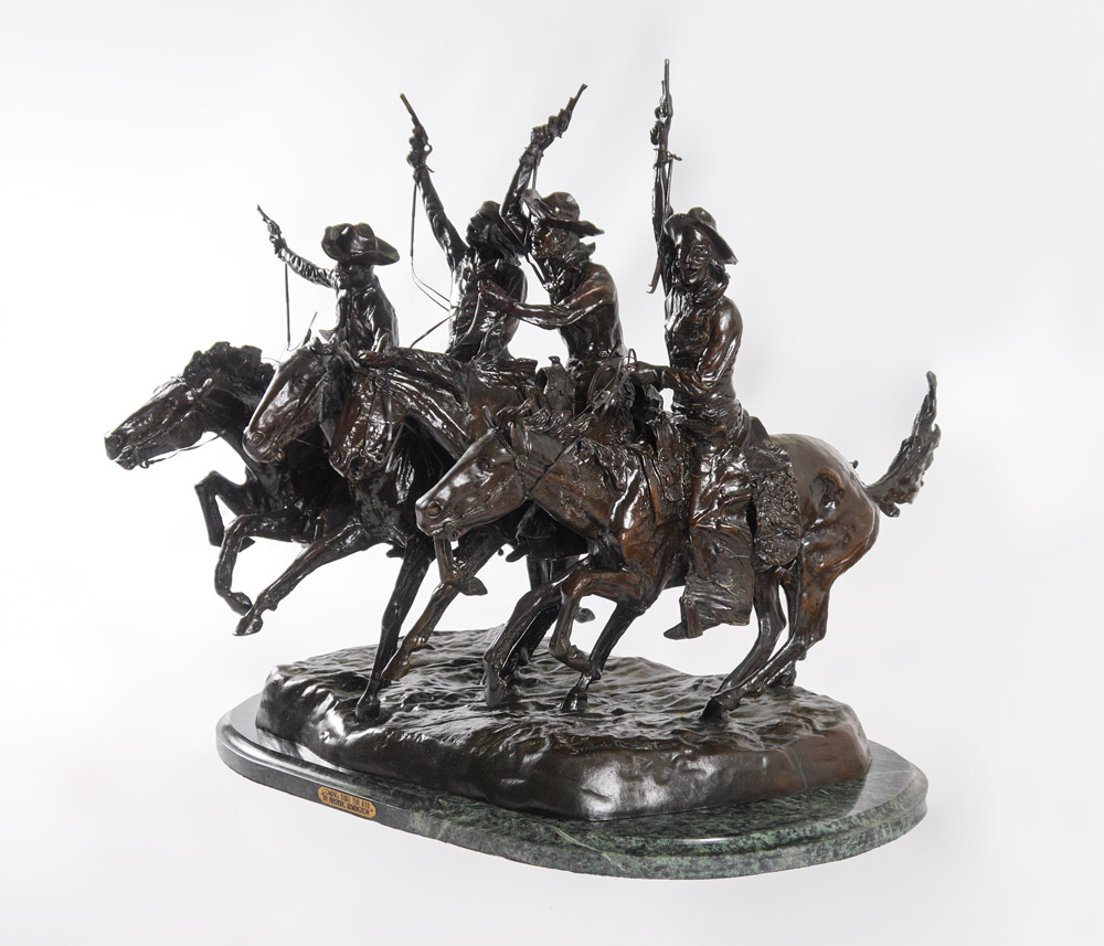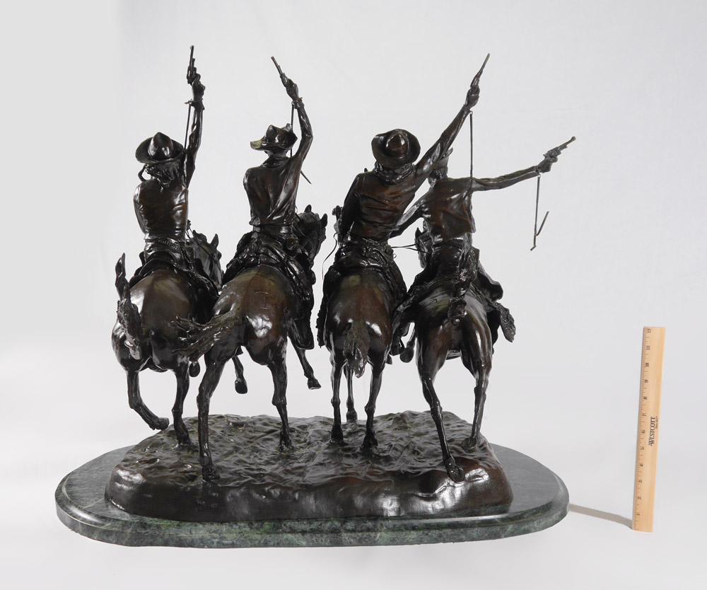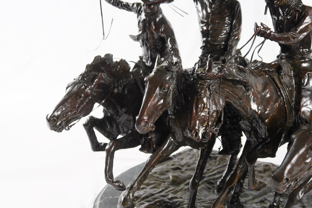 REMINGTON, Frederic, (American, 1861-1909): After Remington, ''Coming Through the Rye'', Bronze, affixed to green marble base, 28 1/2'' h. x 31 1/2'' x 29'', weighs approx. 217 lbs.