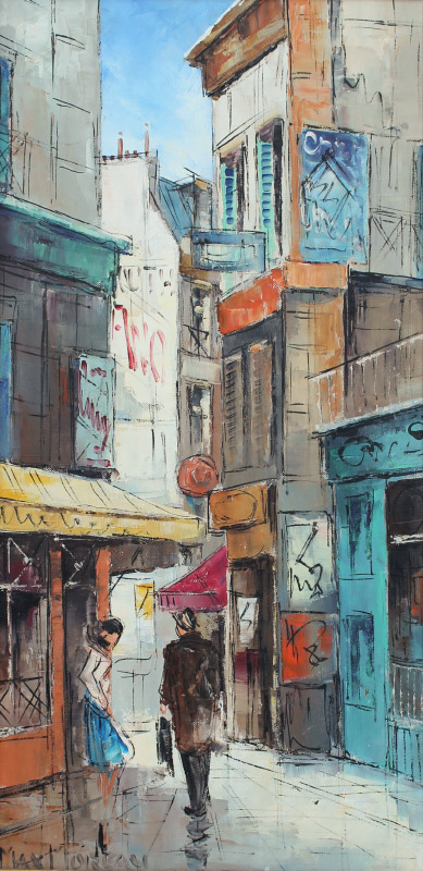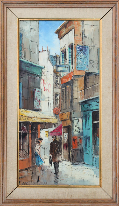 MOREAU, Max, (Portuguese, 1902-1992): Parisian Street Scene, 24'' x 12'', signed lower left, framed, 29'' x 17''.