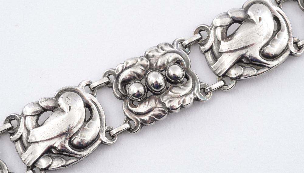 GEORG JENSEN DANISH STERLING BRACELET: Alternating links of doves and foliate motifs, Well marked with 14, Georg Jensen Denmark, 925.S, 7 3/4'' long including clasp.