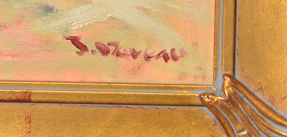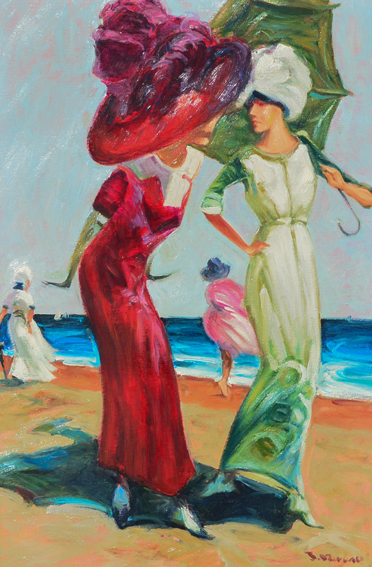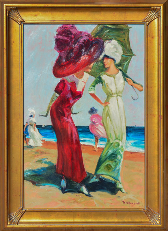ILLEGIBLY SIGNED PAINTING OF 2 WOMEN ON BEACH: Oil/Canvas, 36'' x 24'', signed lower right, fine custom framing, 45'' x 33''.