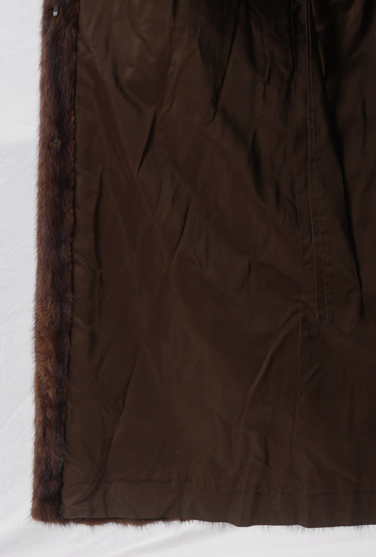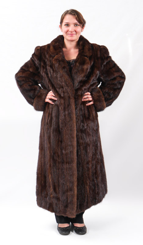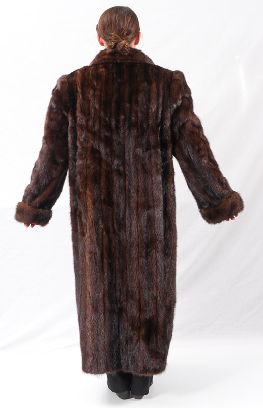 FULL LENGTH MINK FUR COAT: Dark brown mottled with black , silver highlights, rolled cuffs, medium large in size, approx. 49'' collar to hem, 20'' shoulder to shoulder and 26'' shoulder to cuff.