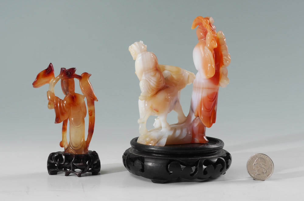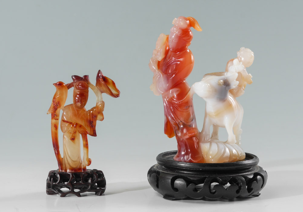 2 CHINESE CARVED AGATE FIGURES: 2 pieces total to include 1) Figure of a boy on an ox next to man standing with fly brush in hand. 4 1/2'' h. x 3 1/2'' x 2 3/4'', sold with wood stand 1 1/4'' h. x 4''. 2) Figure of a man standing with bird of paradise and flower, affixed to wood base, 4'' h. x 2 1/2''.