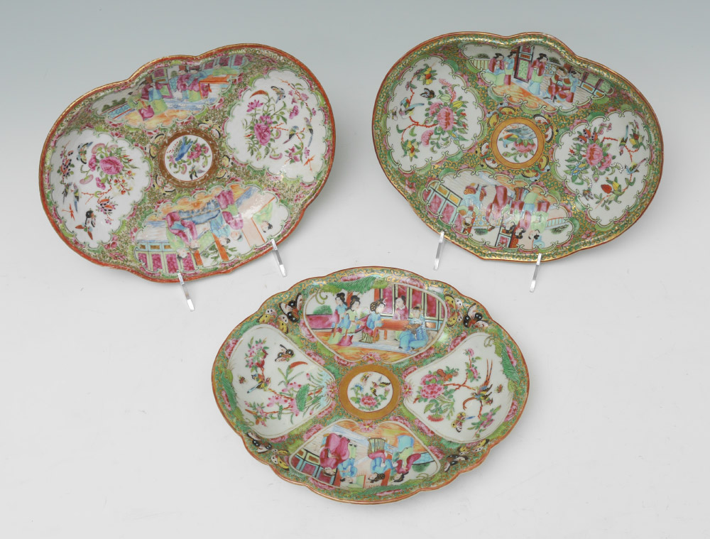 3 CHINESE ROSE MEDALLION SERVING TRAYS: 3 shallow trays, each with typical genre scenes and floral motifs in reserves, 2 of a similar shape rim, the third more rounded rim. Unmarked, largest measures 1 3/4'' h. x 11'' x 9''.