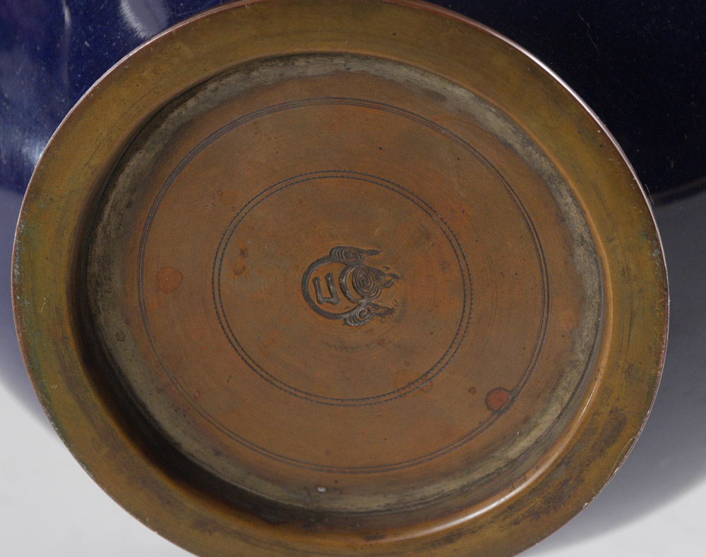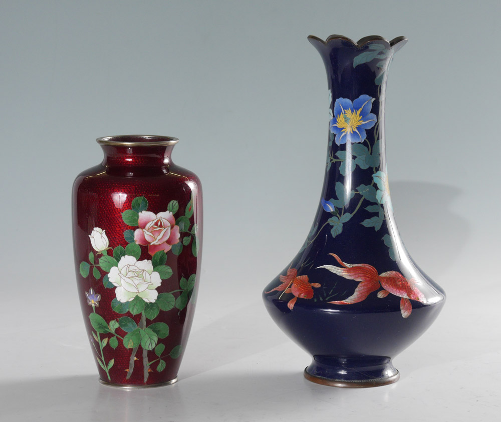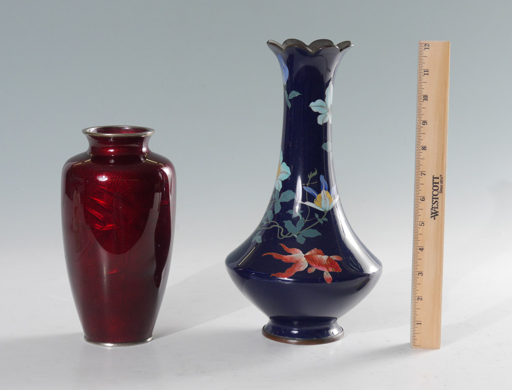 2 CLOISONNE VASES: 2 piece total to include 1) Blue ground with floral motif and goldfish, floriform rim, flared body. Marked on base, 12'' h. x 6 1/2''. 2) Oxblood ground with floral motif, 8 1/2'' h. x 4 1/2''.