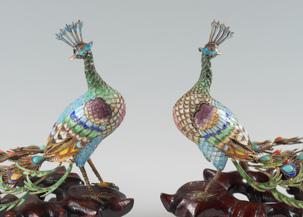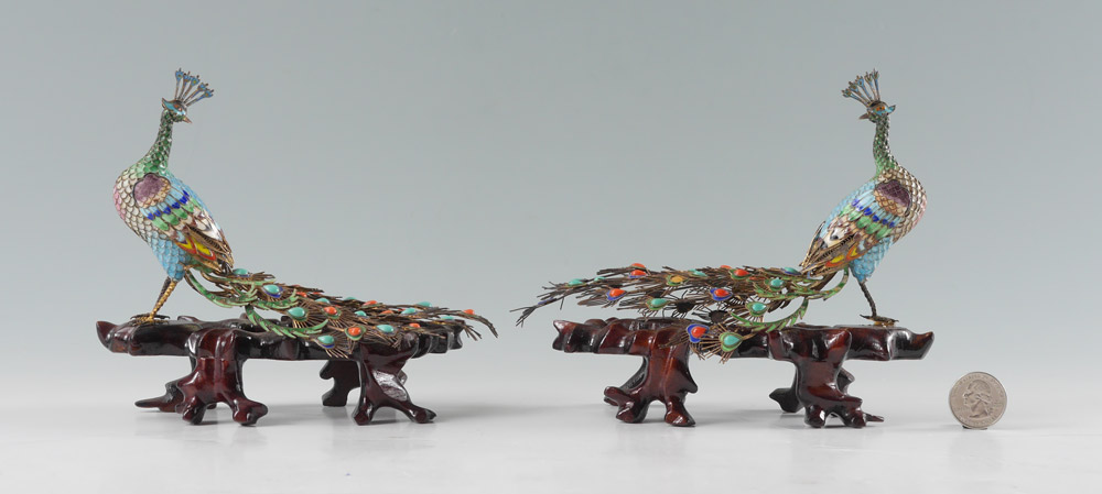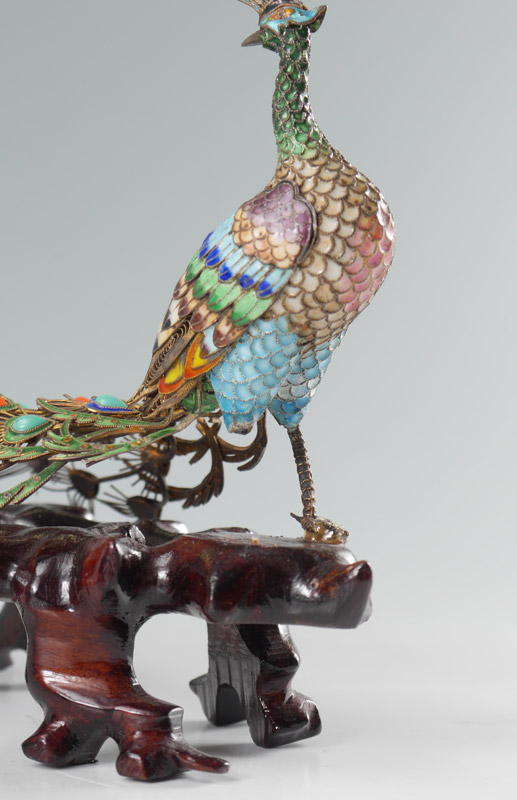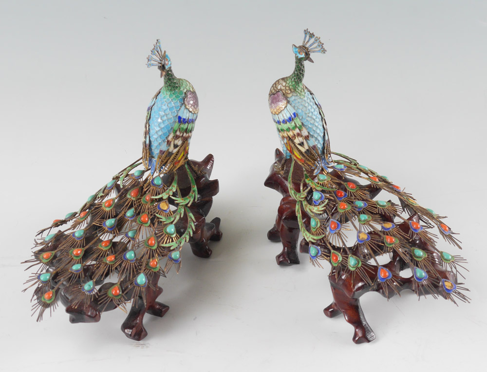 PAIR CHINESE CLOISONNE FIGURAL PEACOCKS: Each with cloisonne body, tail feathers with turquoise and coral cabochons, affixed to root wood bases. Measures 5 3/4'' h. x 7'' x 4''.