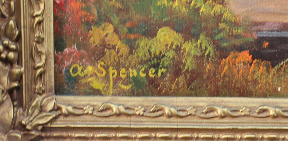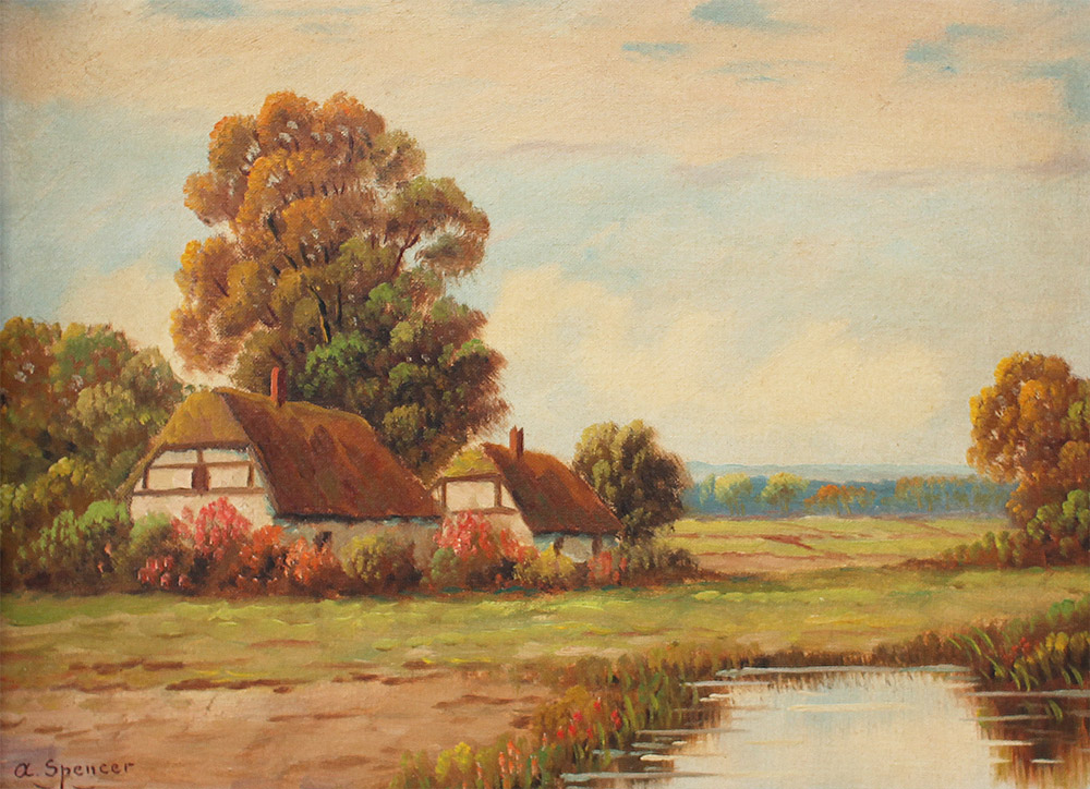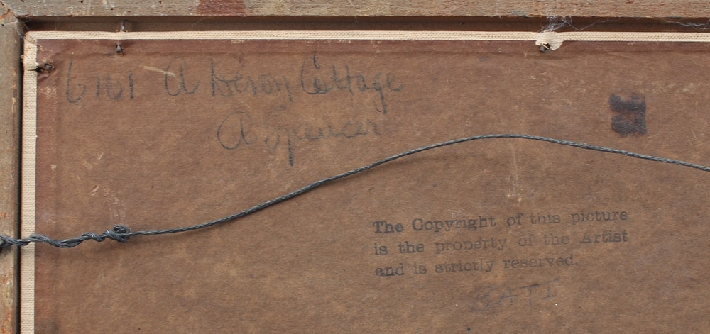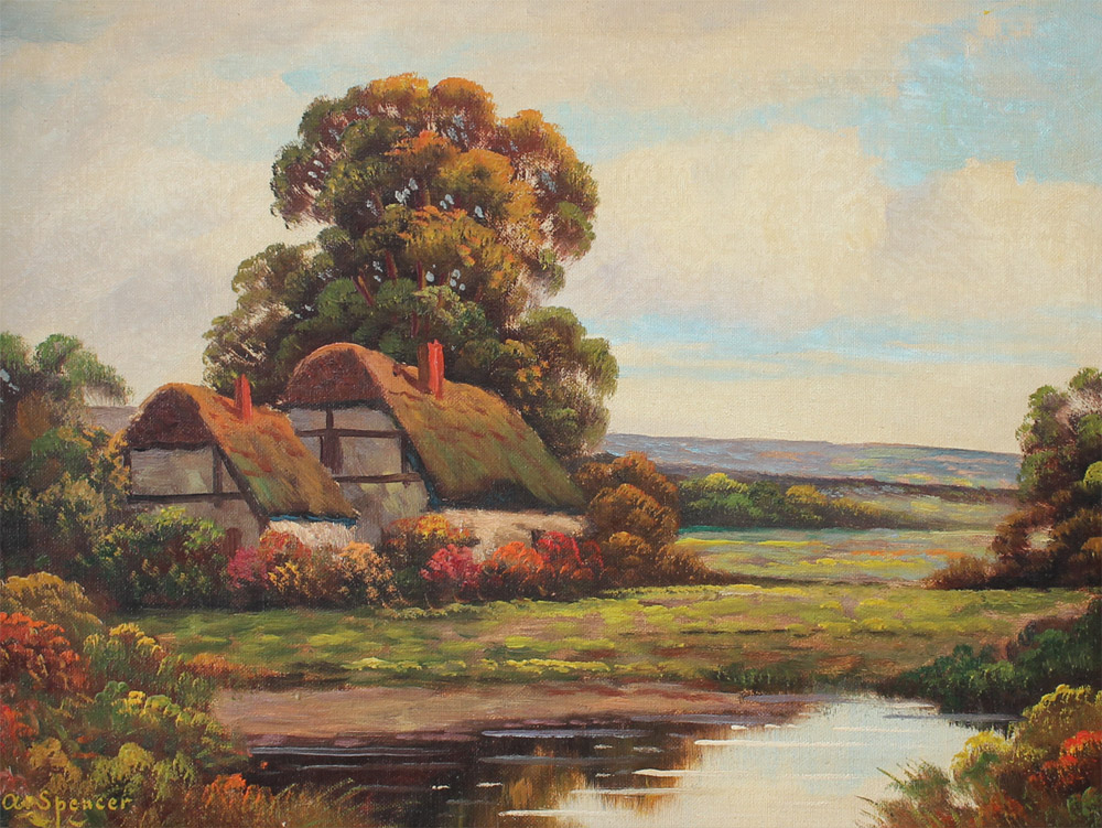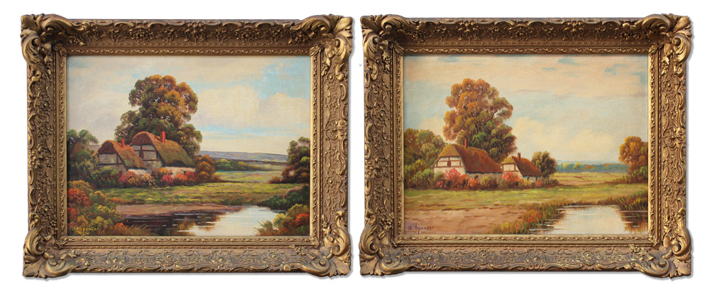 SPENCER, Augustus, (United Kingdom, 1860-1924): Pair of Landscape Scenes, 1) ''A Devon Cottage'', Oil/Canvas Board, sight size 12'' x 16'', signed lower left, painted and carved frame, 16'' x 20'', titled verso 2) ''An Essex Cottage'', Oil/Canvas Board, sight size 12'' x 16'', signed lower left, painted and carved frame, 16'' x 20'', titled verso.
