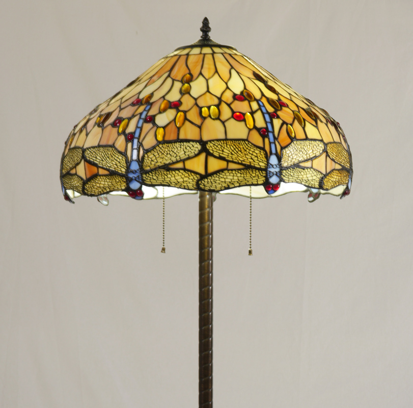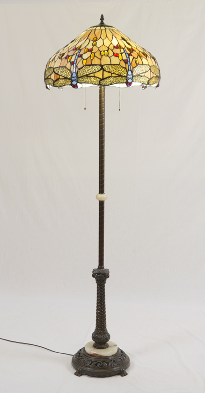 TIFFANY DRAGONFLY STYLE FLOOR LAMP: Patinated metal body and base with onyx accents, 62'' h. x 11 1/2''. Dragonfly motif shade 11'' h. x 19 1/2''.