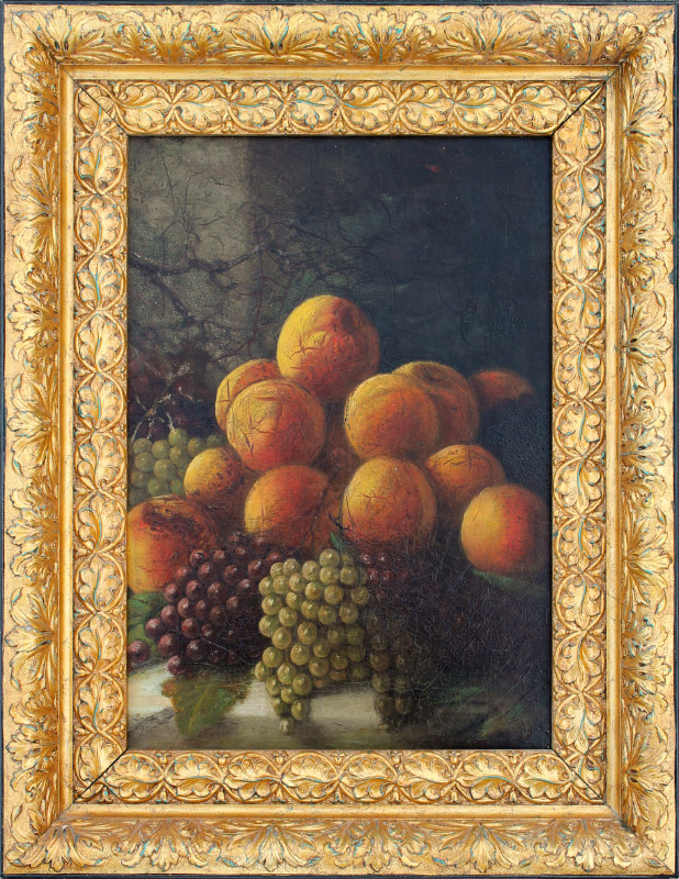 ANTIQUE OIL ON CANVAS STILL LIFE PAINTING OF FRUIT: Oranges and Grapes, 19.25'' x 13.75'', no visible signature, encased in a gilded and painted frame, 26'' x 20''.