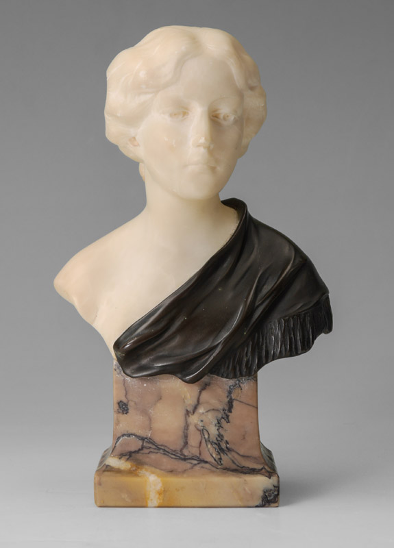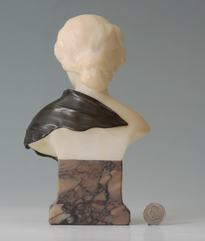 MARBLE & BRONZE SCULPTURE OF A BEAUTY SIGNED FREDERIC: Cream marble bust with bronze shawl, signed and dated 1912 to back, bronze Schumacher mark on the underside of the marble plinth, bust is 6'' x 5.5'' x 3'', overall height is 9''.