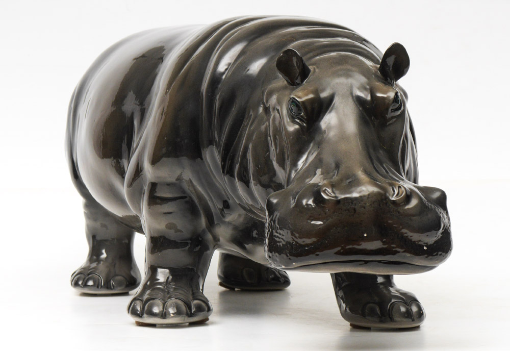 ITALIAN CERAMIC HIPPOPOTAMUS: Signed on back foot Mourau?, Made in Italy, 1282. Measures approx. 13 1/2'' h. x 32'' x 11 1/2''.