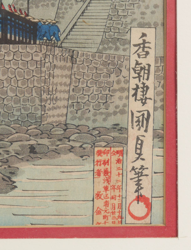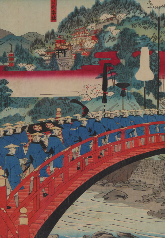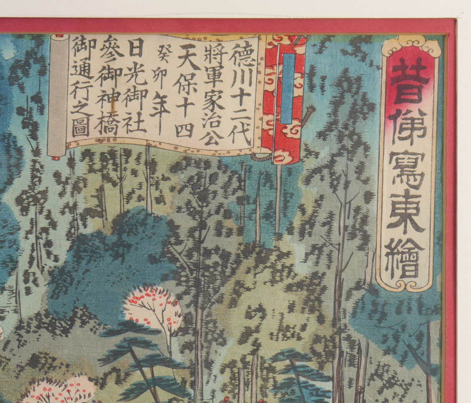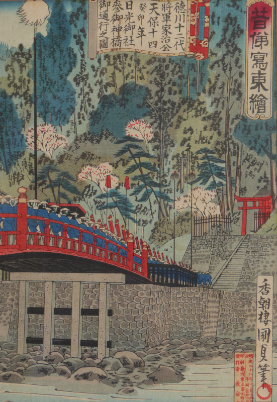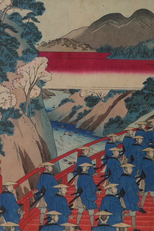 JAPANESE WOODBLOCK TRIPTYCH UKIYO-E : Vast scene with bridge and figures, 13'' x 27.5'' sight size, framed, 21'' x 35''.