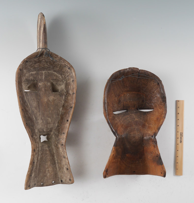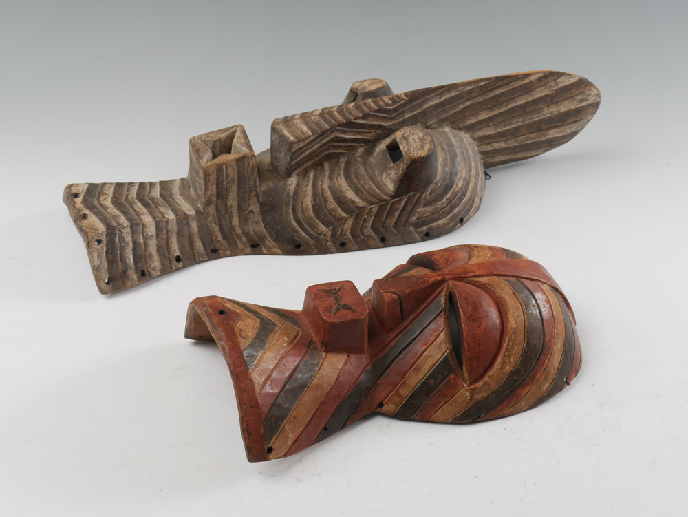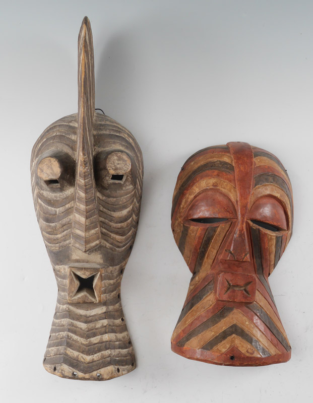 TWO SONGYE KIFWEBE AFRICAN CARVED MASKS: 2 pieces total, Songye Tribe, Kifwebe Society, Democratic Republic of Congo, to include 1) White paint decorated, 27 1/2'' h. x 9'' x 6''. 2) Red, black and yellow paint decorated, 17'' h. x 9 3/4'' x 3 3/4''.