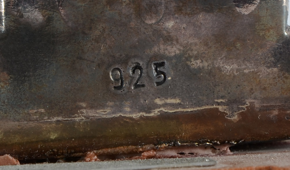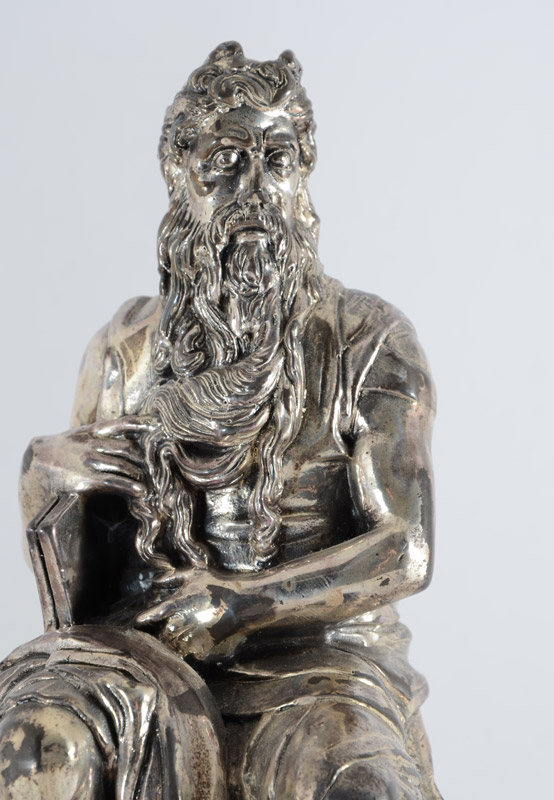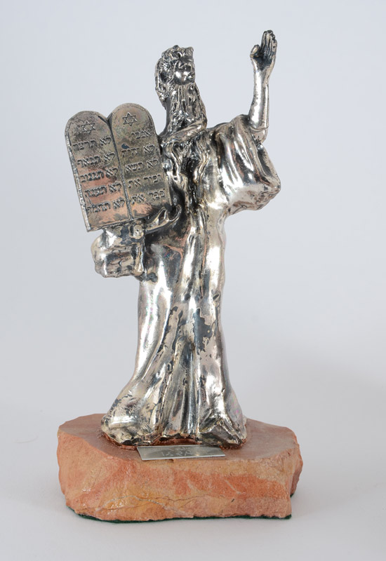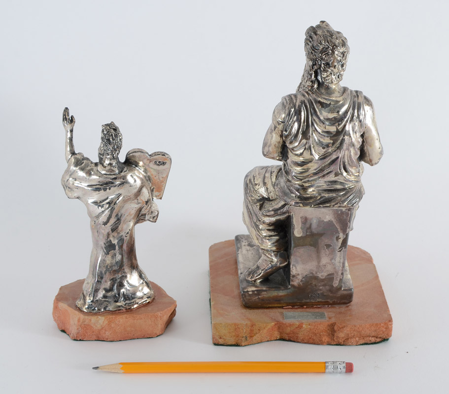 2 ISRAEL SILVER CLAD FIGURES OF MOSES: 2 pieces total to include 1) Figure of Moses seated, stamped 925, mounted to stone, plaque with owner's name. 9'' h. x 5 1/8'' x 5 1/2''. 2) Figure of standing Moses, stamped 925, mounted to stone, plaque with owner's name. 6 3/4'' h. x 3 1/2'' x 2 1/2''.