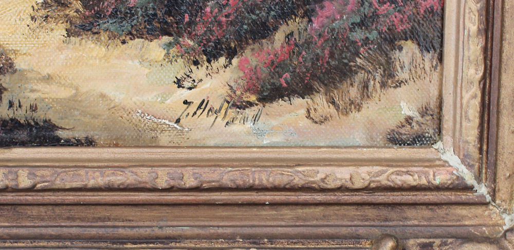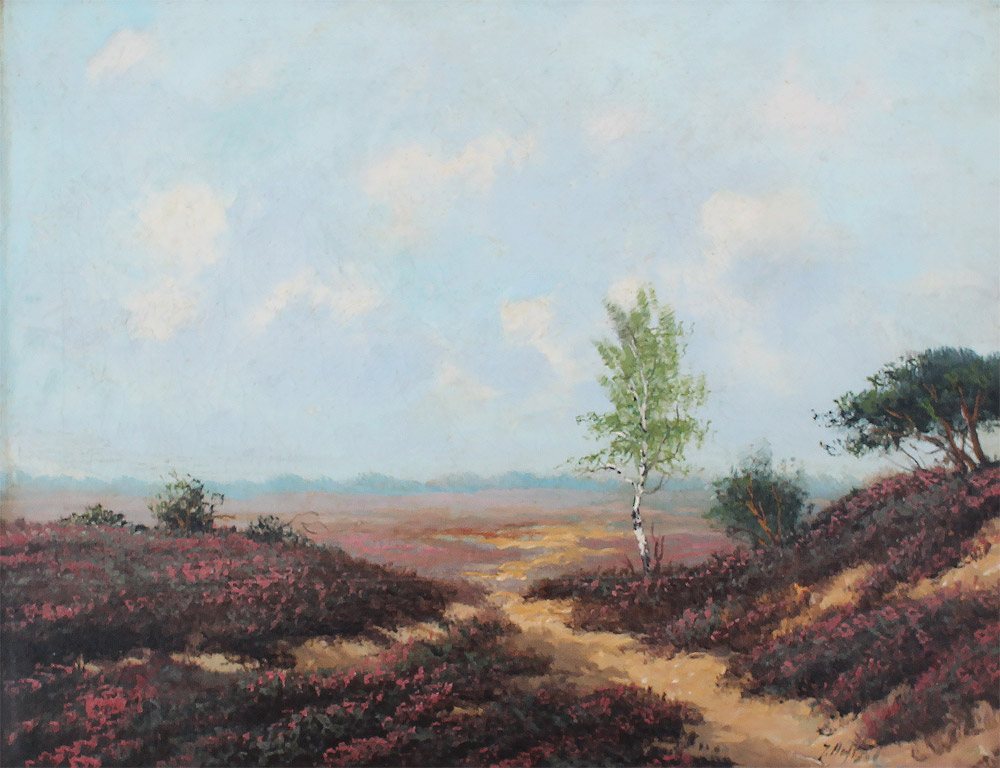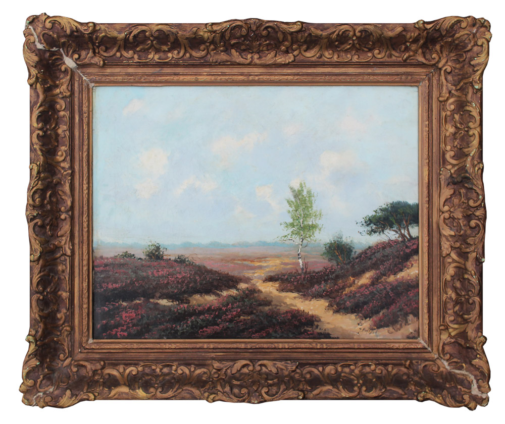 DUNES LANDSCAPE PAINTING WITH WILDFLOWERS AND LONE BIRCH TREE: Oil/Canvas, 14'' x 17.75'', signed lower right, gilded gesso frame, 19.5'' x 24'', signed lower right J? Hofland.