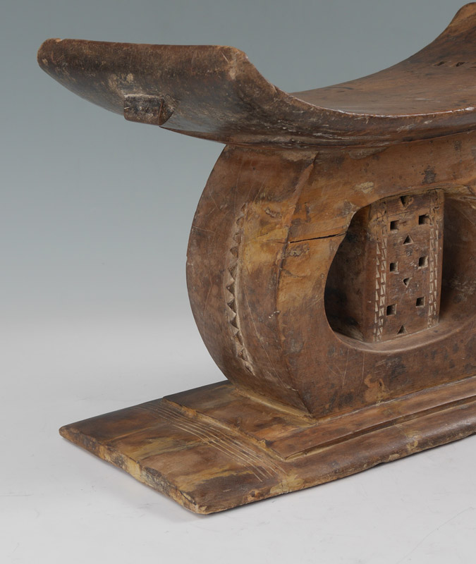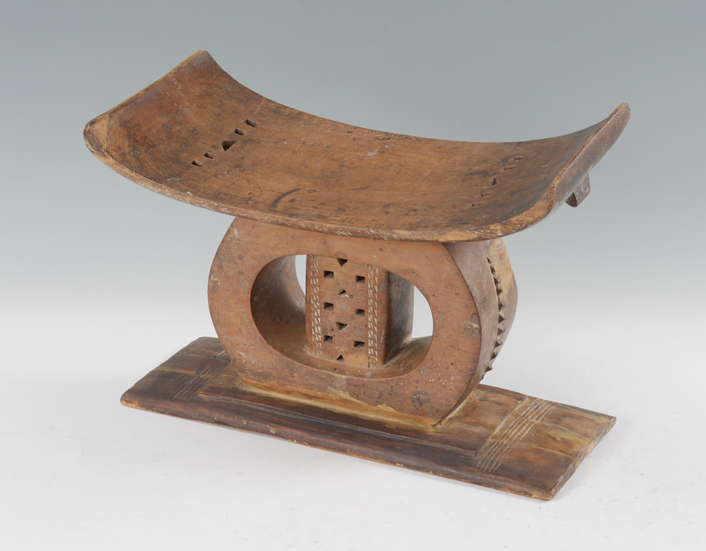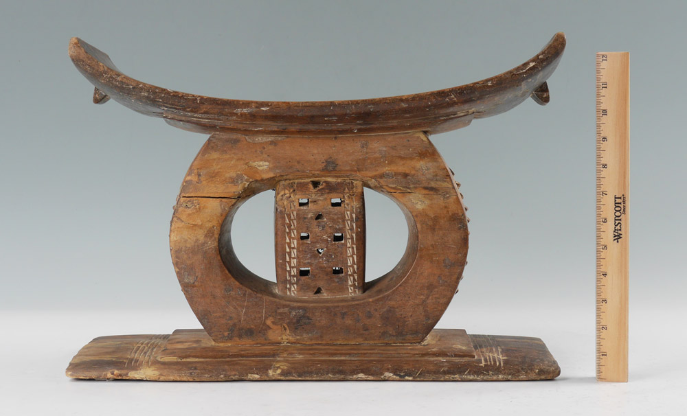 CARVED AFRICAN ASHANTI STOOL: Concave seat, carved base, Ashanti Tribe, Ashantiland, overall measures 12'' h. x 18'' x 8 3/4''.