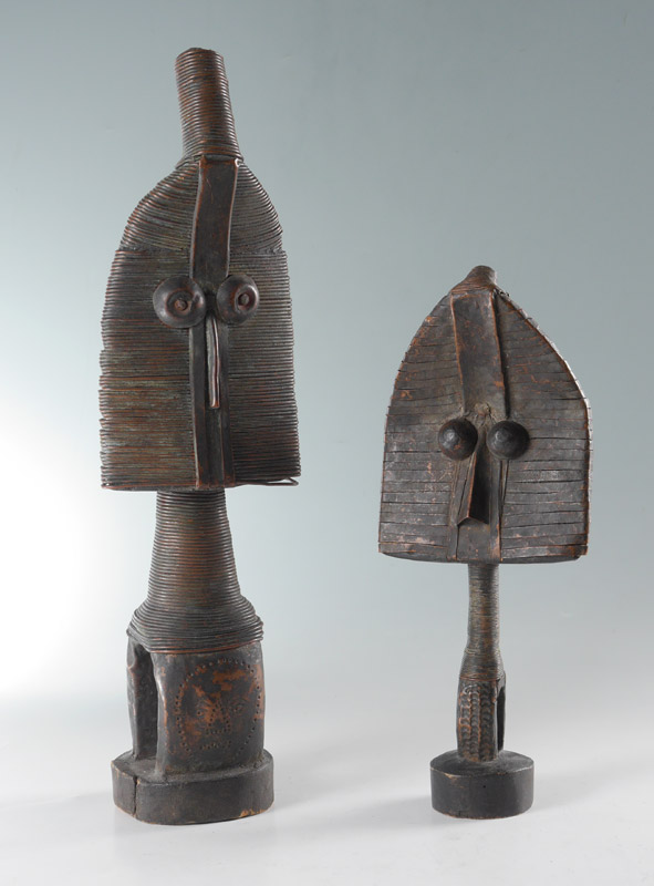 2 MAHONGWE COPPER & WOOD CARVED AFRICAN RELIQUARY FIGURES: Gabon, 2 piece total, 1) 19 3/4'' h. x 5 1/2'' x 4 1/4''. 2) 14 1/4'' h. x 6'' x 3 1/2''.