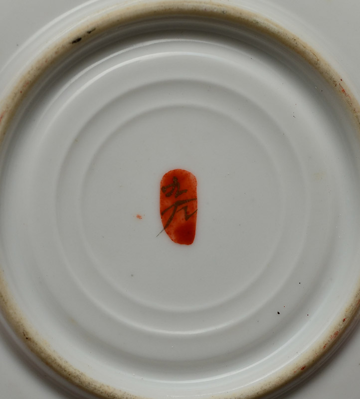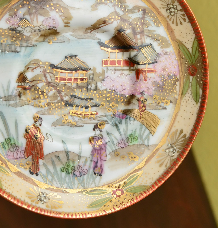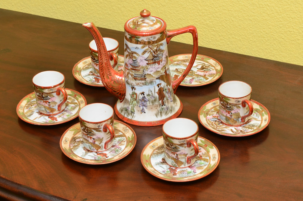 JAPANESE SATSUMA TEA SET: 12 pieces total with typical outdoor genre scenes, signed on bases, to include a teapot, (6 1/2'' h. x 6 1/2''); 5 cups (2'' h.), 6 saucers (4 1/8'' dia.).