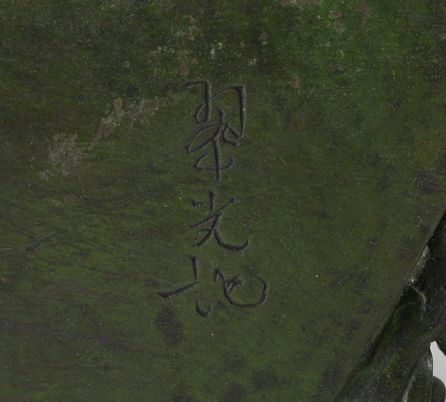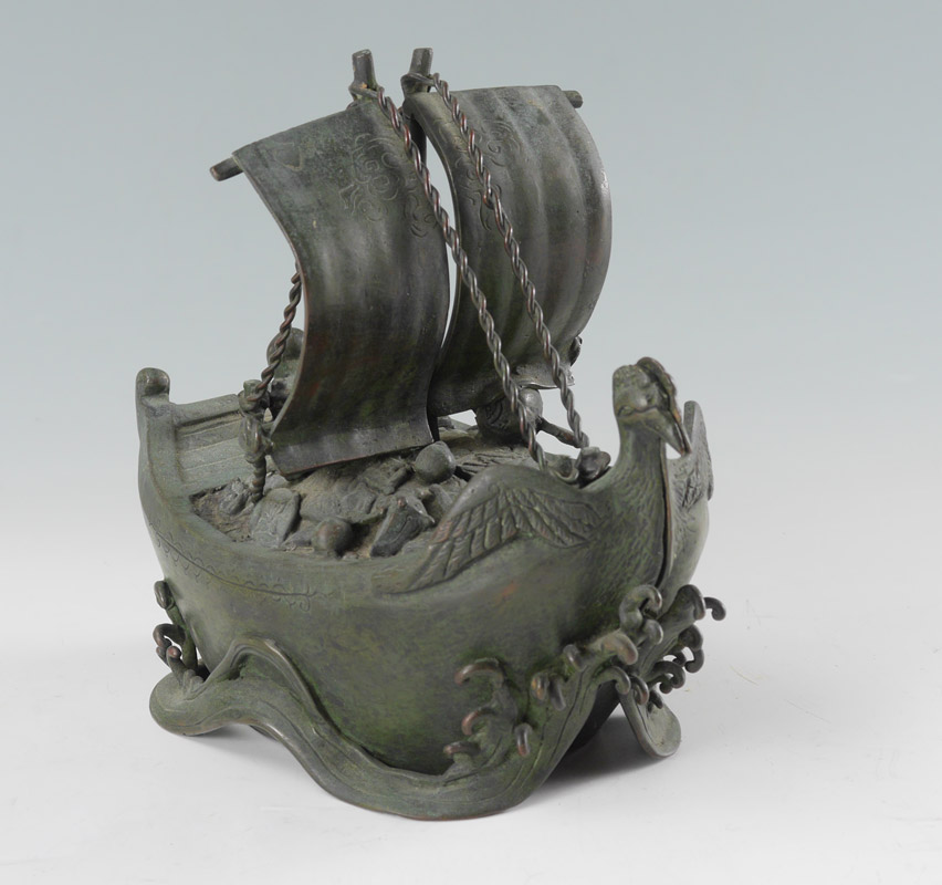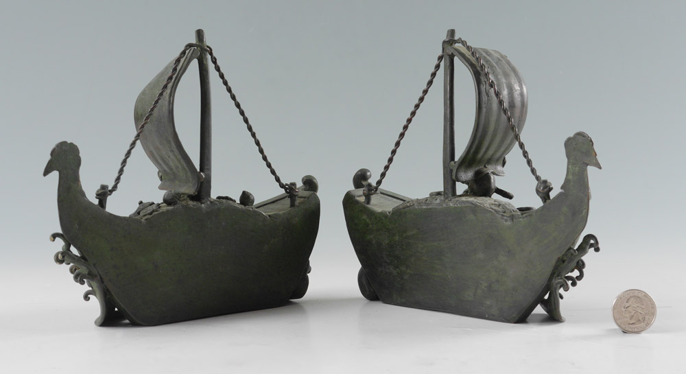 PAIR SIGNED CHINESE BRONZE BOAT BOOKENDS: Figural rooster head bow, mirror image half boat shaped bookends, signed, overall measures 6 3/4'' h. x 7 3/4'' x 2 1/4''.