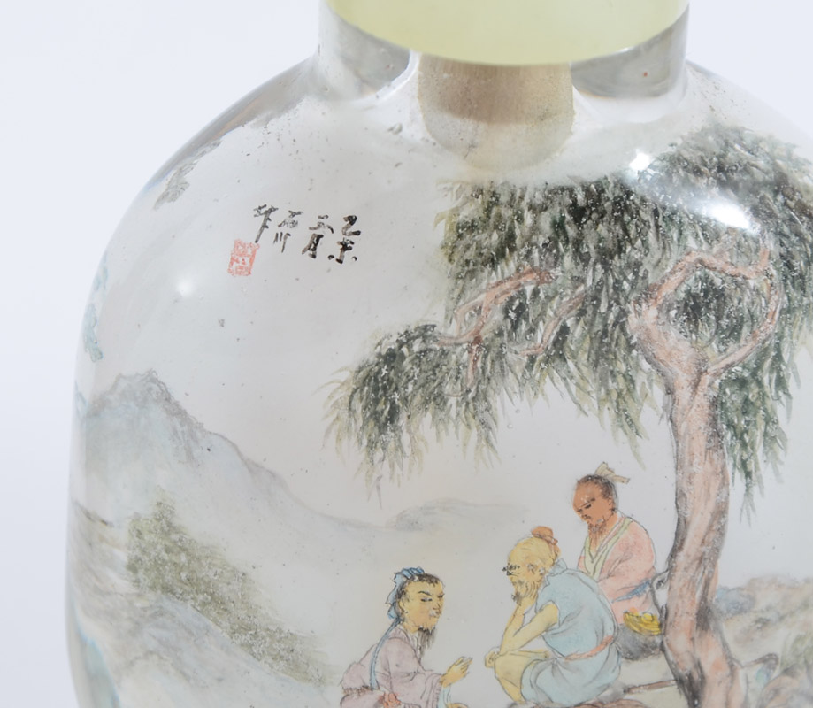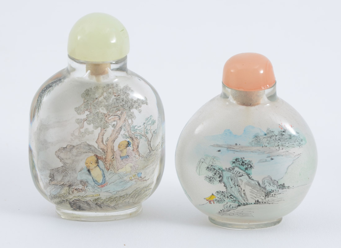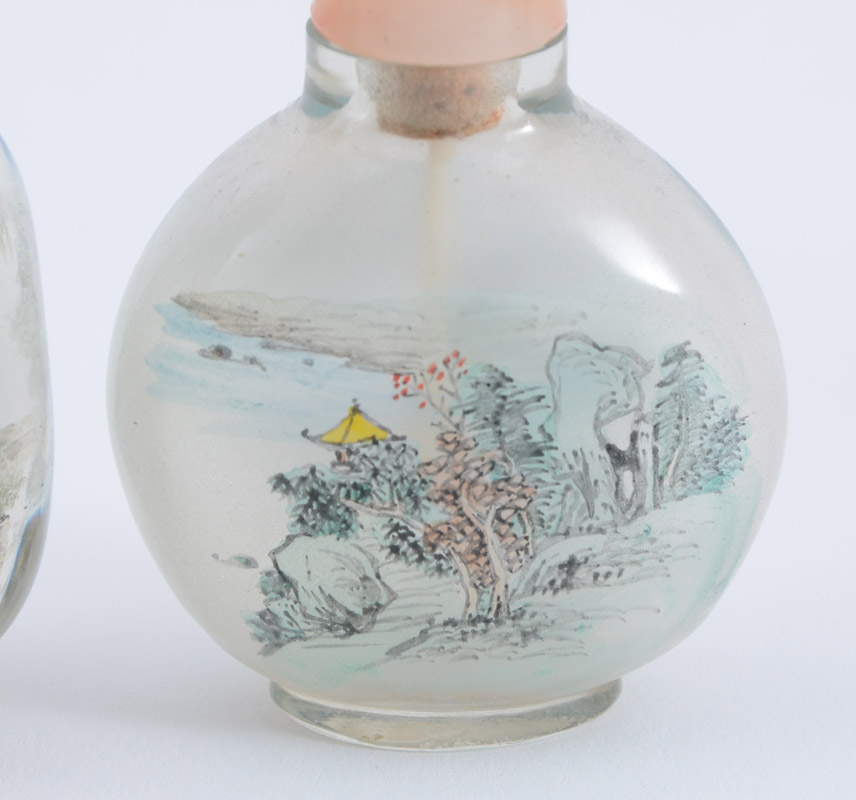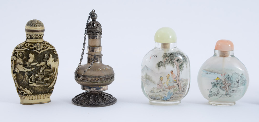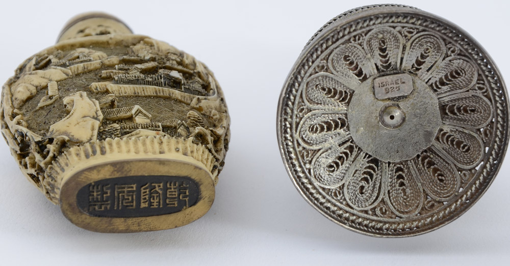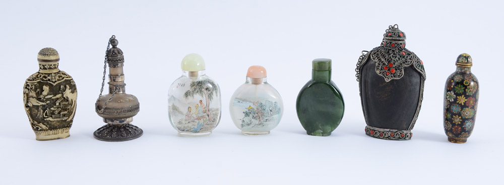 ESTATE COLLECTION OF 6 SNUFF BOTTLES: 7 assorted bottles, the 6 snuff bottles to include metal mounted carved wood with coral and turquoise (3 3/4'' h.), 2 reverse painted glass, spinach jade, carved white lacquer, and cloisonne. Sold with an Israeli silver perfume (3 1/2'' h.).
