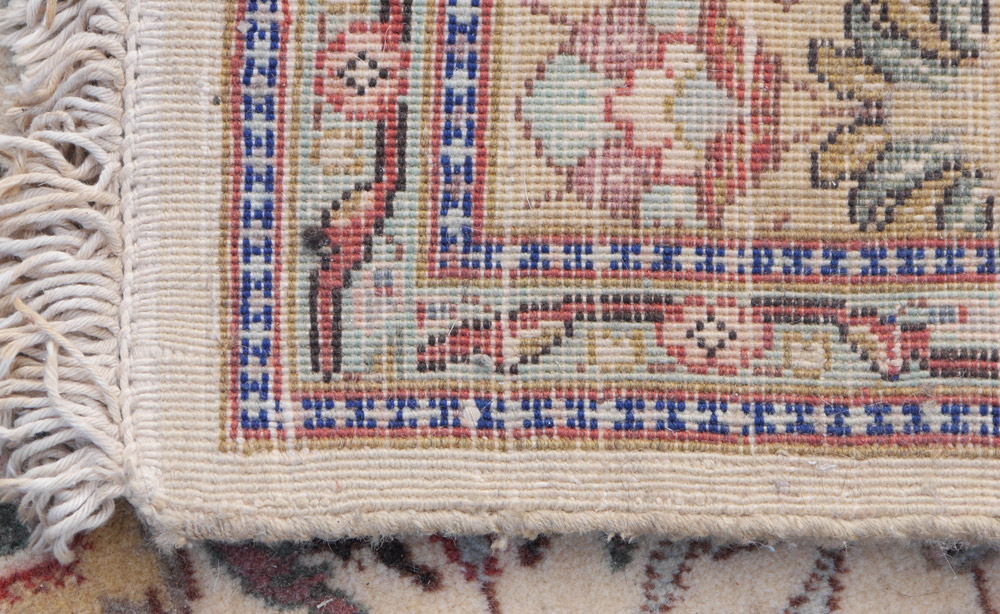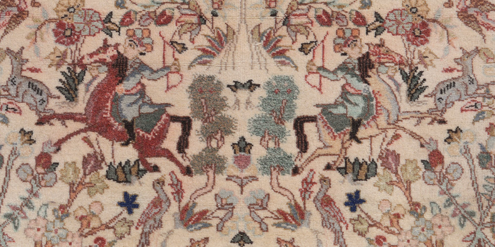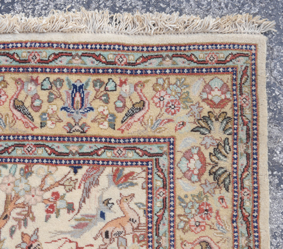 APPROX. 20-40 YR. OLD PERSIAN HUNT SCENE HAND KNOTTED WOOL RUG, 4'8'' x 6'2'': Hunting scenes have been a popular subject on rugs and tapestries for centuries. This is a well-drawn 20th century version. On the ivory field the hunters on horseback aim their arrows at various game (deer, gazelles) while a variety of birds look on from the relative safety of the verdant plants and trees that fill in the design of the rug. The design is well spaced and well balanced in colors used. A charming rug that you will notice something different every time you look at it. Condition is good.