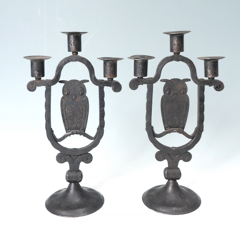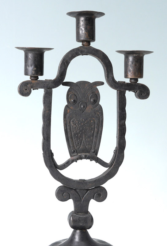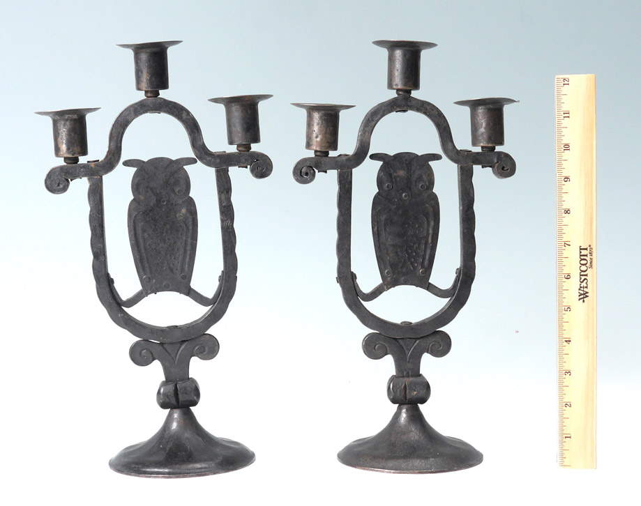 GOBERG (Hugo Berger) PAIR OF OWL ARTS AND CRAFTS CANDELABRA: Wrought iron, three light candle holders, at the center is the owl. 13.5'' tall x 7''. Stamped Rasper Austria, indicating the pair was fabricated by Goberg in his Rasper Studio in Austria.