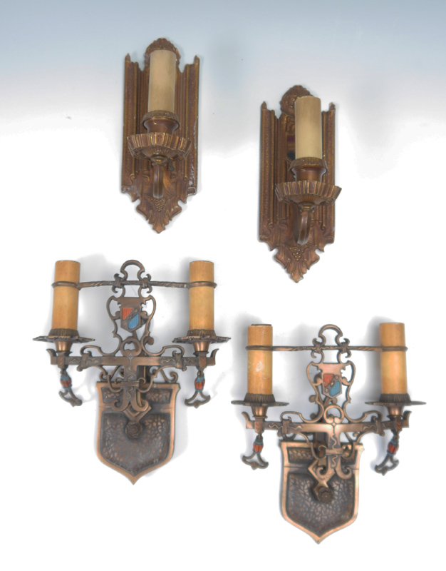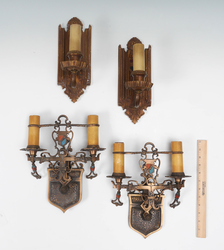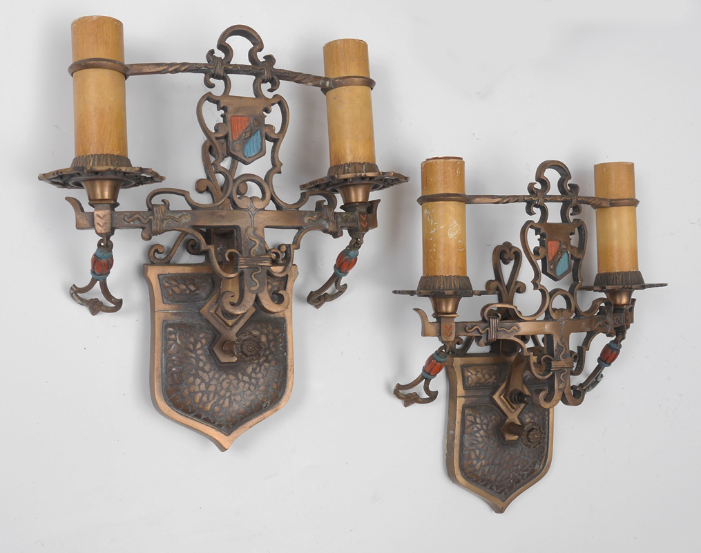 TWO PAIR MOE BRIDGES STYLE WALL SCONCES: 2 pairs, both electric, to include 1) Double light, polychrome and patinated metal frames, 13'' h. x 10 3/4'' x 4 1/4''. 2) Single light, patinated metal frame, marked S & A Pat. on back, 11 1/2'' h. x 4 1/2'' x 6''.