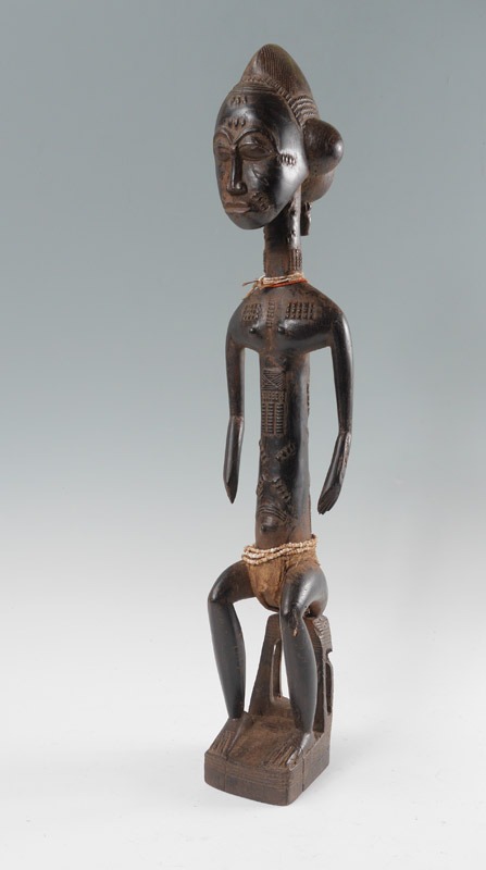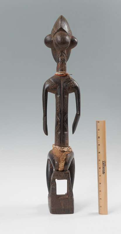 YORUBA CARVED AFRICAN FIGURE: Seated carved figure adorned with beads and loin cloth, Nigeria, 26 1/4'' x 5 1/2'' x 5 1/4''.