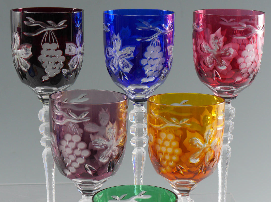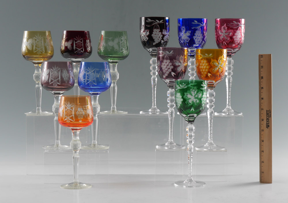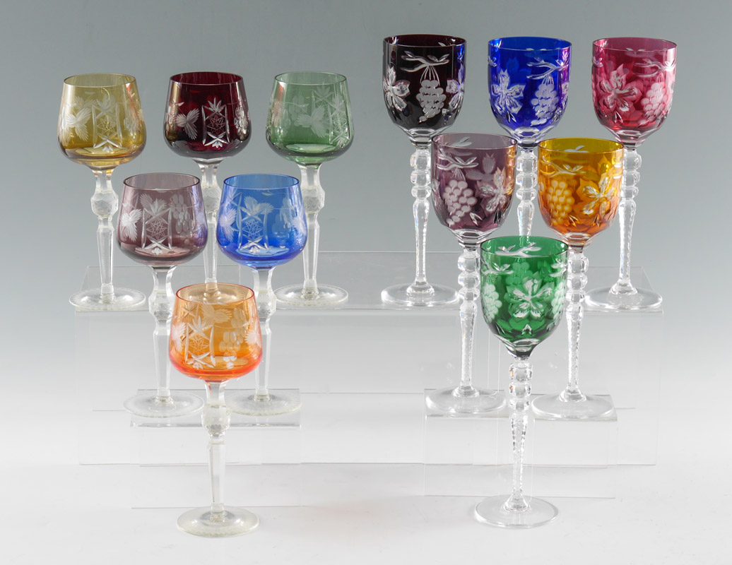BOHEMIAN CUT TO CLEAR STEMWARE & GOBLETS: 12 multicolored stems in 2 similar but not identical grape vine motif patterns and stems to include 6 (9 3/4'' h.), 6 (8 1/2'').