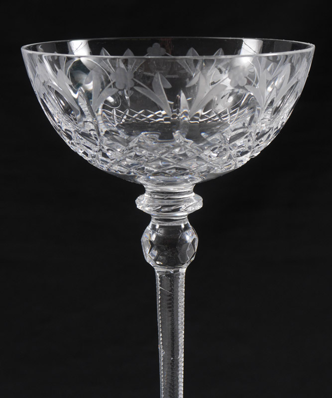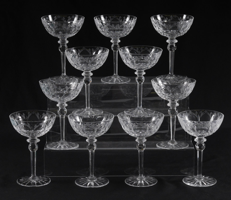 SET OF 10 ROGASKA CRYSTAL TALL CHAMPAGNE / SHERBET GLASSES IN THE QUEEN PATTERN: 7'' tall x 4.75'' dia. Oh what fun!!