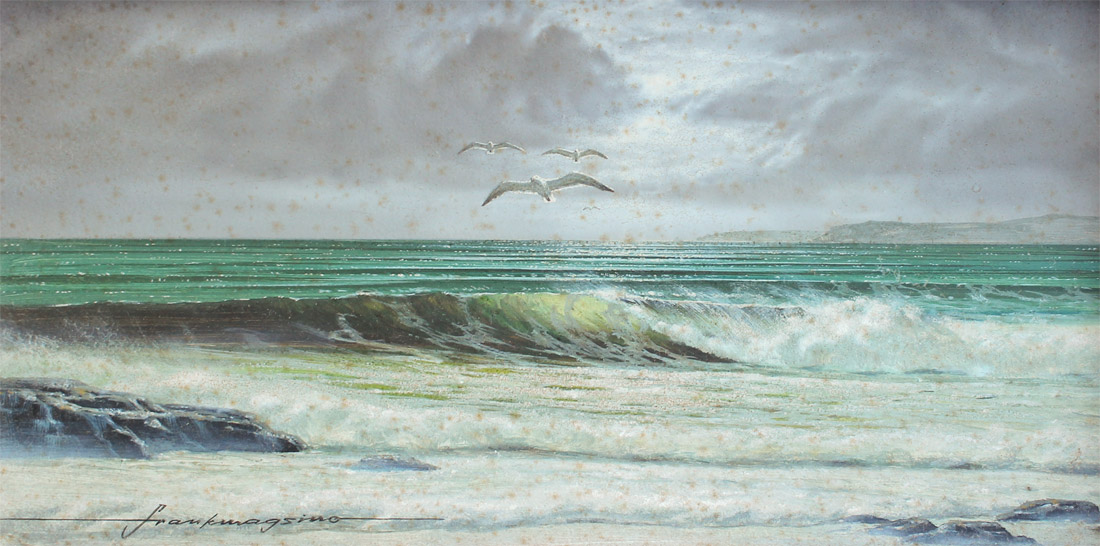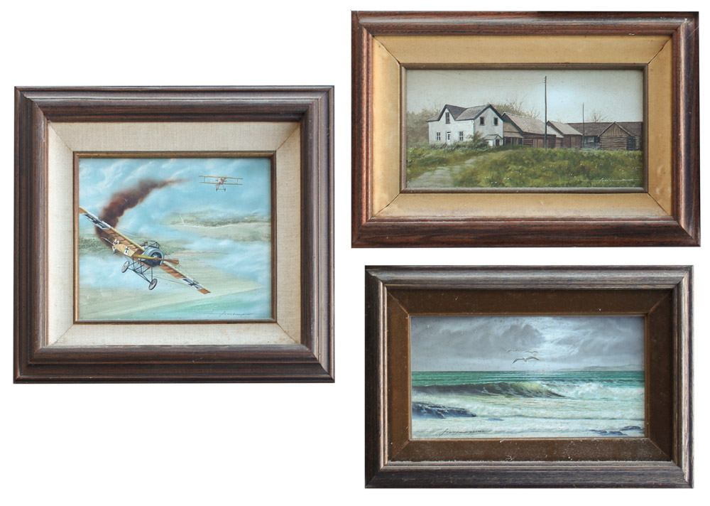 MAGSINO, Frank, (American, 1937-): 3 piece lot, 1) Peaceful surf scene with gulls, Oil/Masonite, 6'' x 12'', signed lower left, framed, 12'' x 18''; 2) WWI Fighter Plane Dogfight, Oil/Masonite, 8'' x 10'', signed lower right, framed, 14'' x 16''; 3) View of an outbuilding with log cabin-style buildings, Oil/Masonite, 6'' x 12''. signed lower right and framed, 11.5'' x 16.5''.