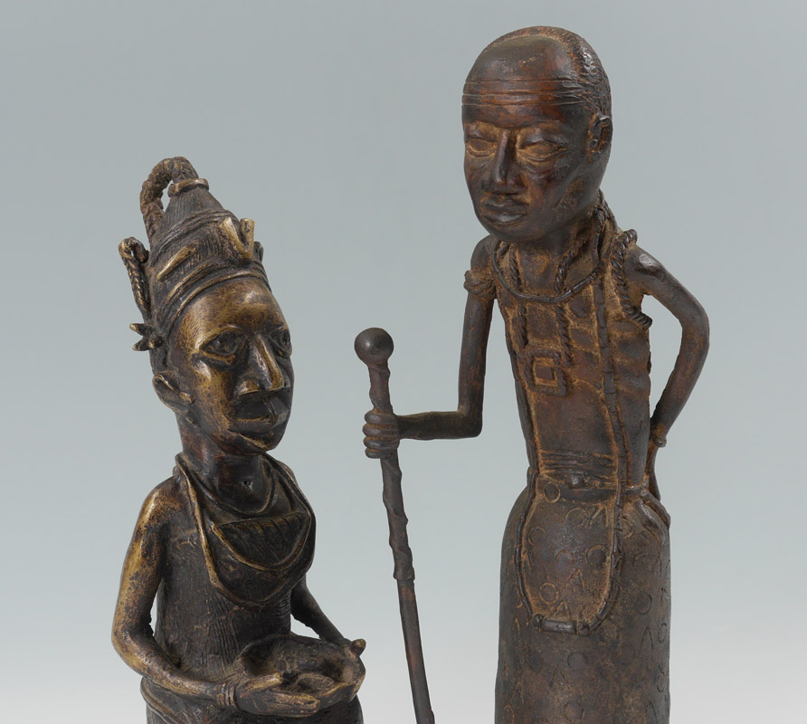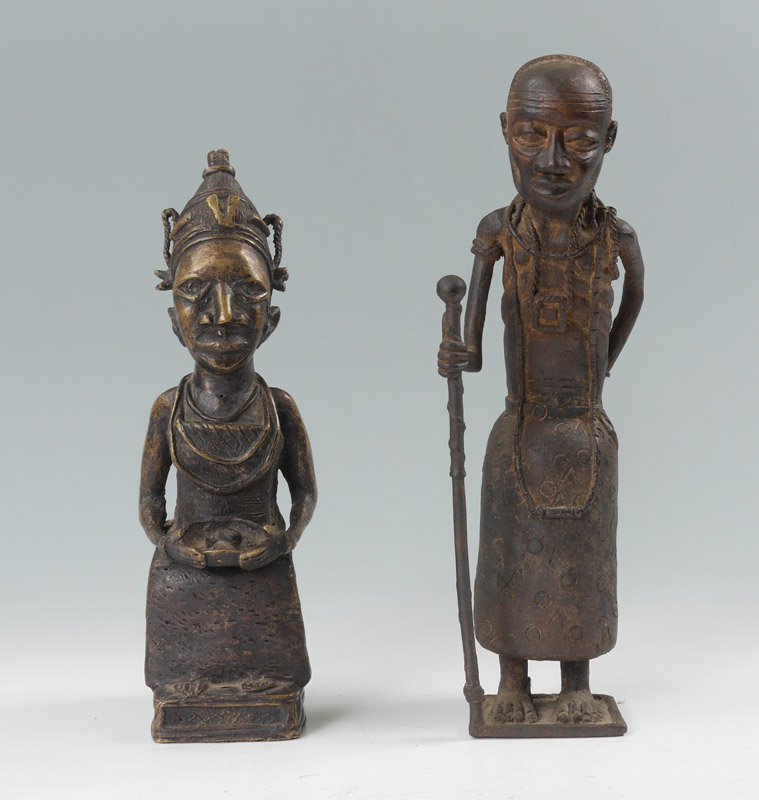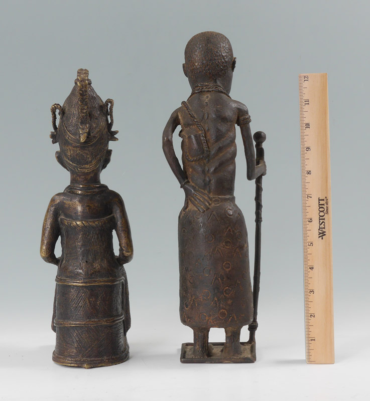 2 PIECE CAST BRONZE AFRICAN FIGURES: To include 1) Standing man with staff, 24 1/4'' h. x 4'' x 5 1/2''. 2) Seated figure with bowl, 12 3/4'' h. x 3 1/2'' x 5''.