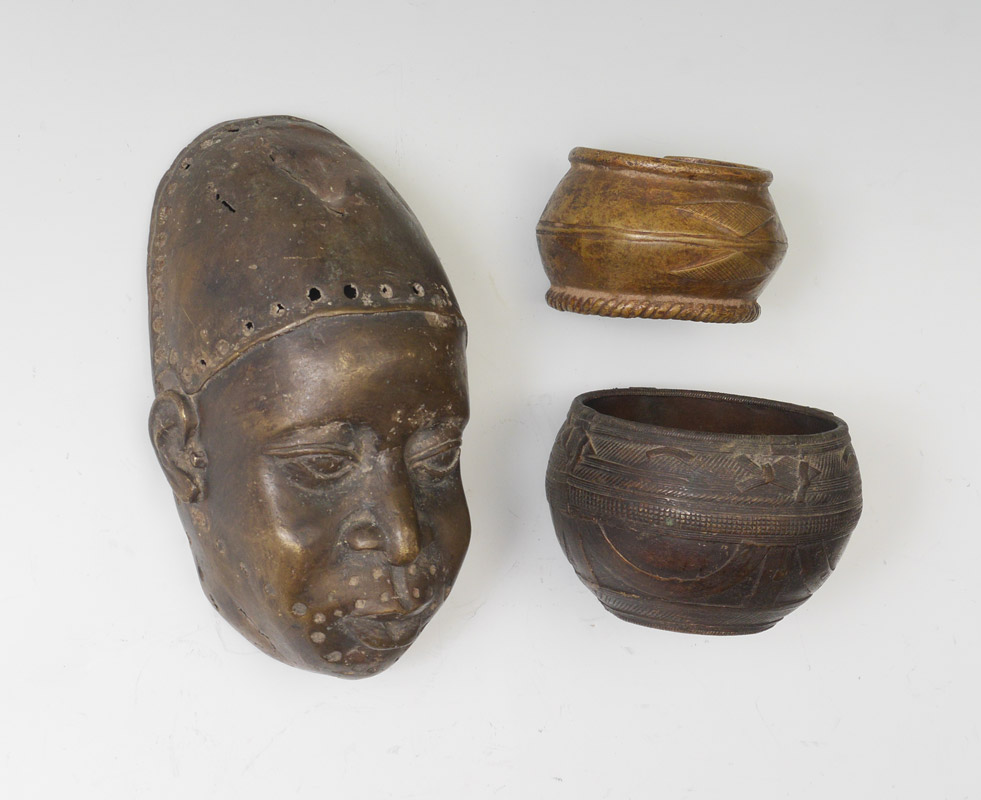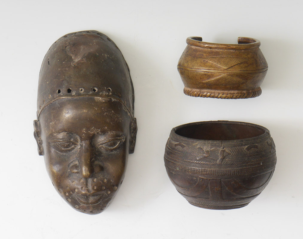3 PIECE AFRICAN BRONZE ITEMS: 3 pieces total to include 1) Mask, 9 1/2'' x 5'' x 4''. 2) Bowl, 3 1/2'' h. x 5 1/4''. 3) Large bracelet, 4 1/2'' dia.